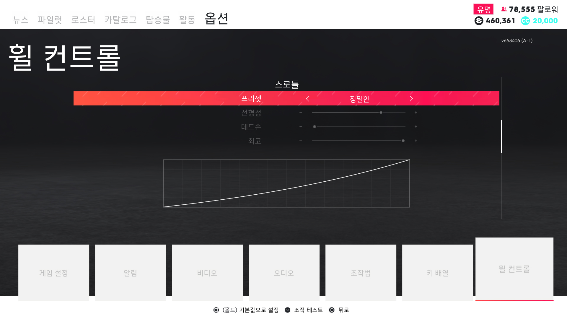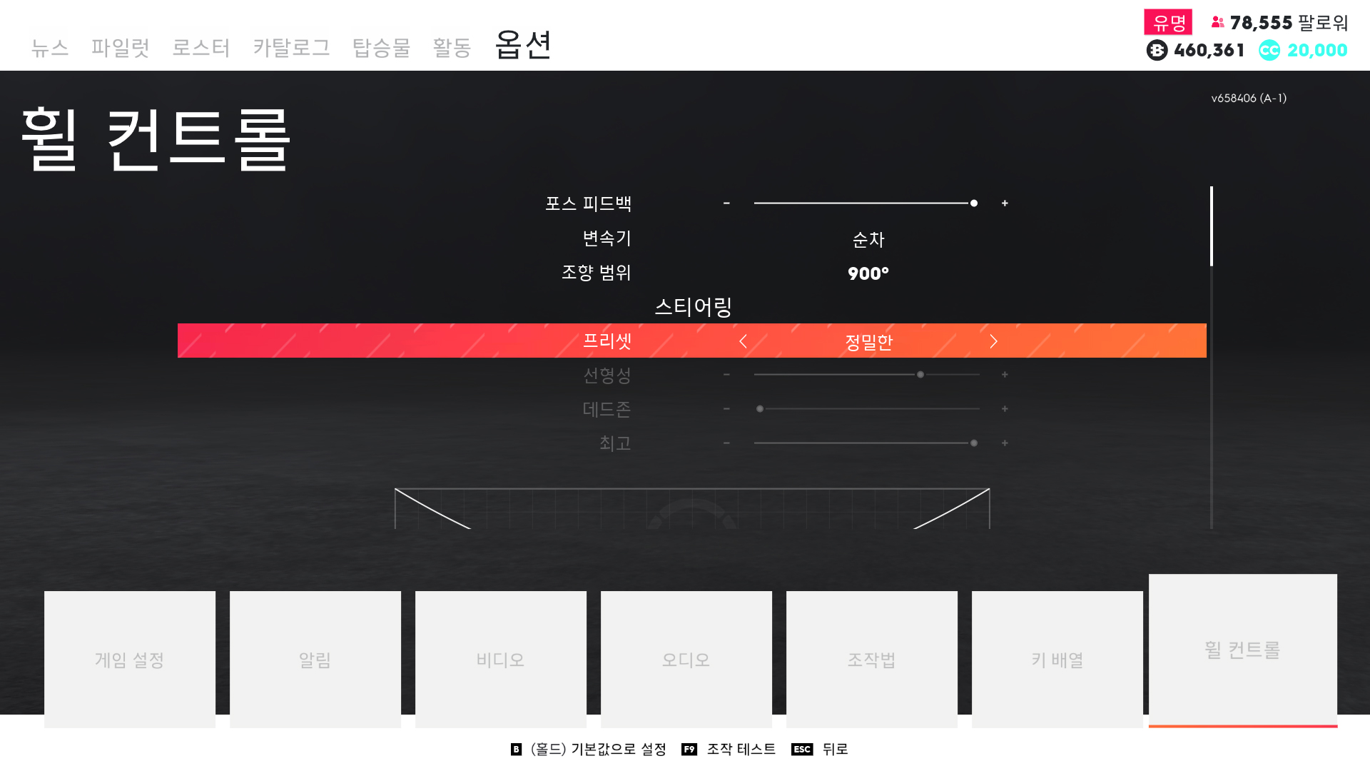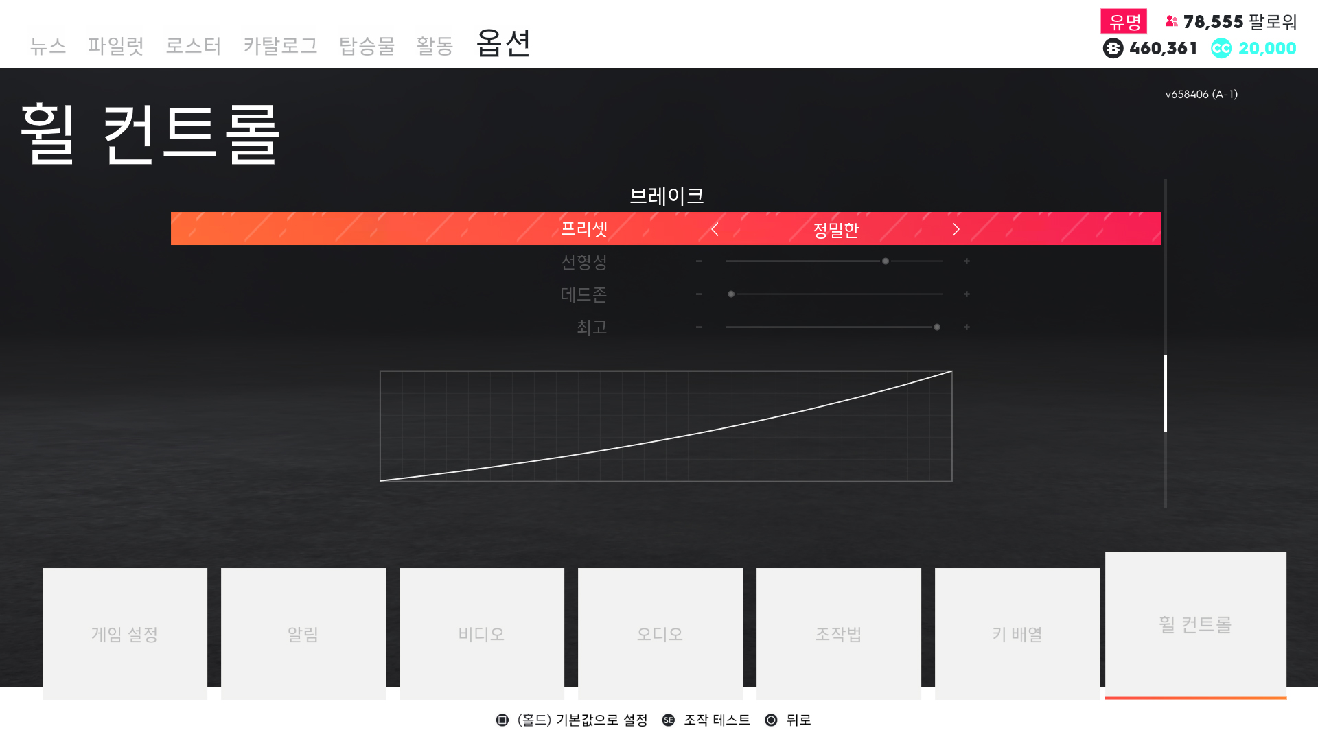 스티어링, 스로틀, 브레이크 - 모두 정밀한으로 세팅해서 데드존을 없애주세요.