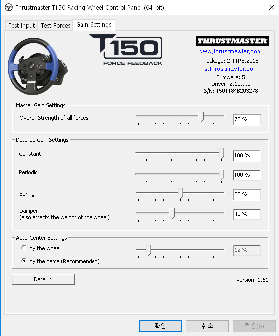 포스피드백 100 - 게임 내 포스피드백이 이상해서 최대한으로 설정해줘야 코너링시 휠 복원력, 기타 포스피드백을 느낄 수 있습니다.