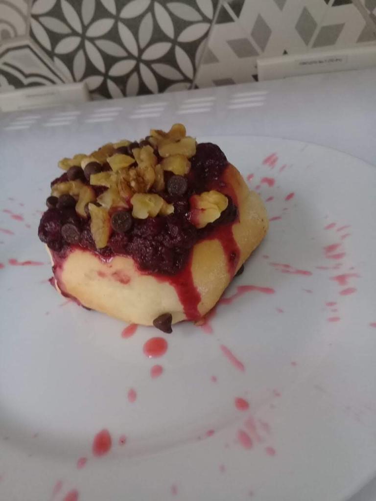 Luego del plato fuerte, cerramos con este delicioso postre, un bizcocho de vainilla, elaborado con una textura muy suave y casi logrando que se deshaga en la boca del cliente. Para adornar este delicioso bizcocho, tomamos frutillas, frambuesas, arándanos, los procesamos y cocinamos a fuego lento, logrando como resultado una salsa roja y dulce, y para darle el toque final le colocamos unas gotas de esencias de rosas. Y como se aprecia en la imagen, adornamos, y nos pareció que quedaría excelente una corona de nueces, logrando como resultado, lo que en la imagen aprecian.