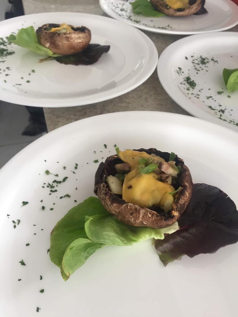 Se aprecia un champiñón portobello, relleno con vegetales picados finamente y salteados con ciertos condimentos y un poco de aceite de oliva, luego de rellenarlos, se les colocó una lámina de queso cheddar y se les colocó pimienta negra, un poco de sal y le rociamos aceite de oliva extra virgen, y se llevaron al horno por menos de 5 min. A la hora de la montura, en el plato se colocó dos hojas de lechuga baby, tipo romana, pero más pequeña y con un sabor más dulce, y perejil alrededor.