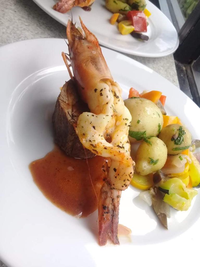 Como plato fuerte se sirvió un lomo muy suave, con langostino y salsa negra, como proteína. Este lomo y langostino fueron marinado con dias de anticipacion para que se sintieran los sabores y lograr que la carne tuviese un gusto único. Como carbohidrato fueron unas papas seleccionadas para lograr un tamaño casi igual y no romper con la armonía del plato, estas papas se cocinaron, luego de estar a un término de cocción prudente, luego fueron salteadas con mantequilla y perejil fresco. Y por último una ensalada de vegetales, cocinada al vapor.