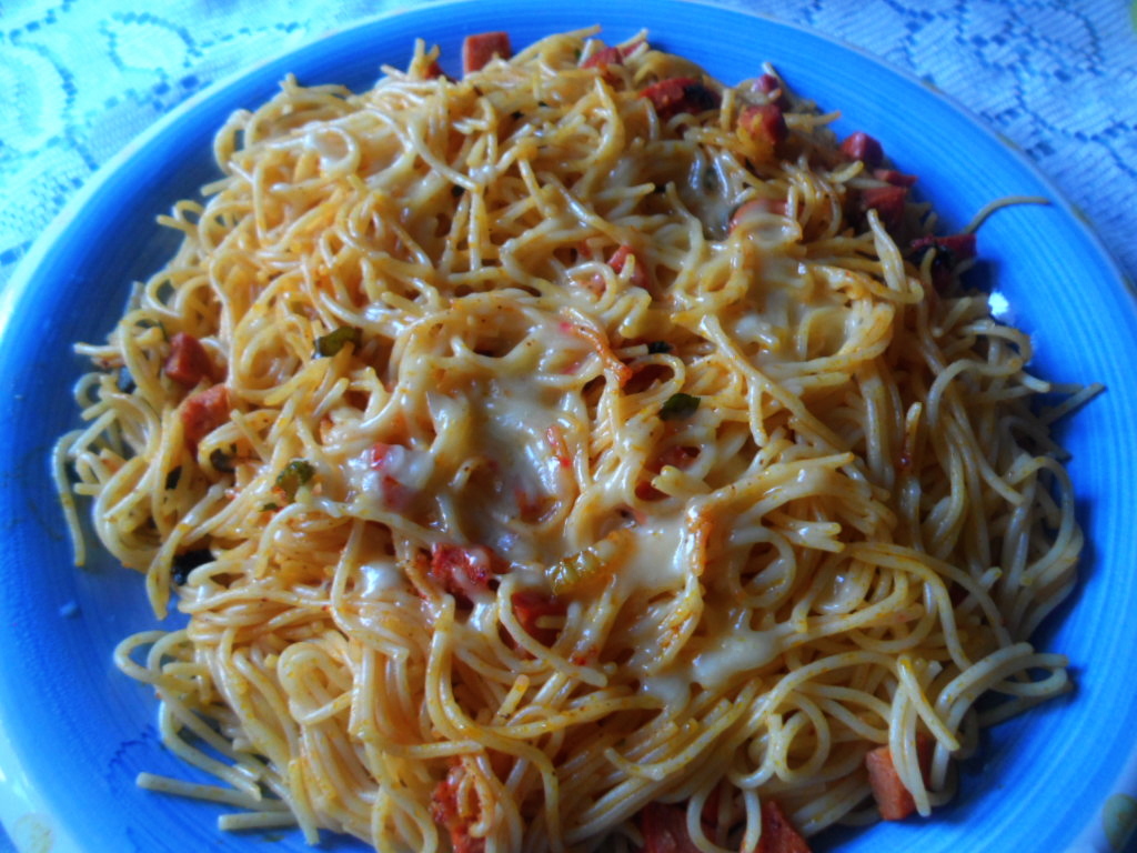 Pasta con salchicha y queso derretido.