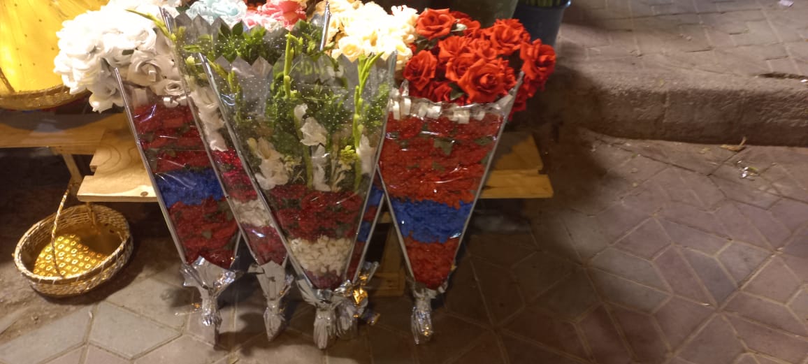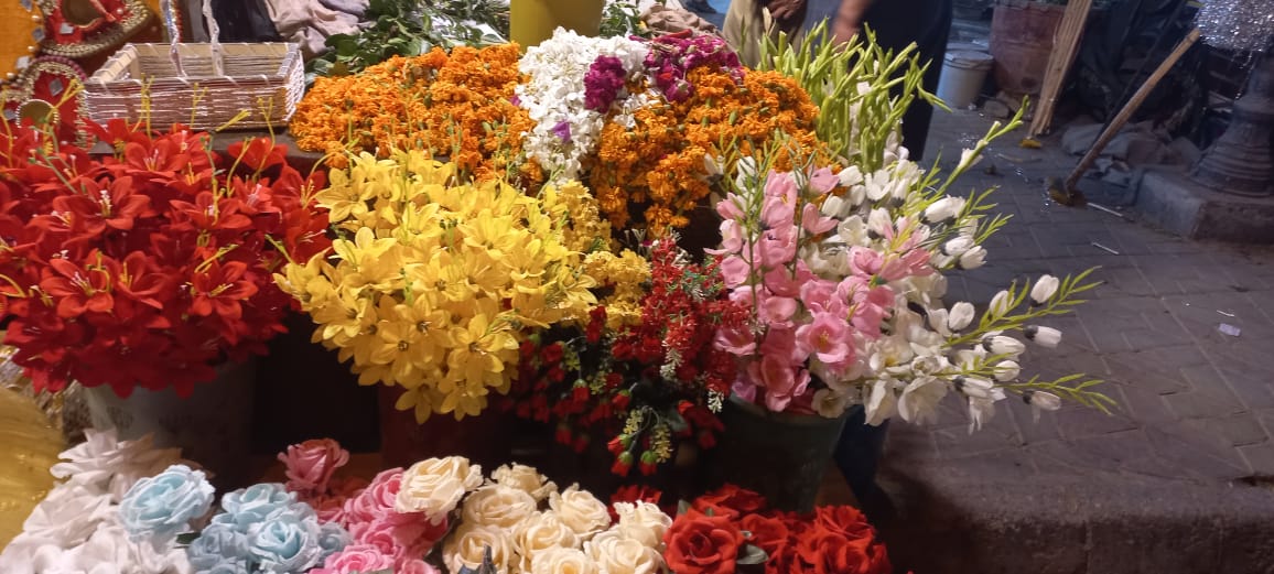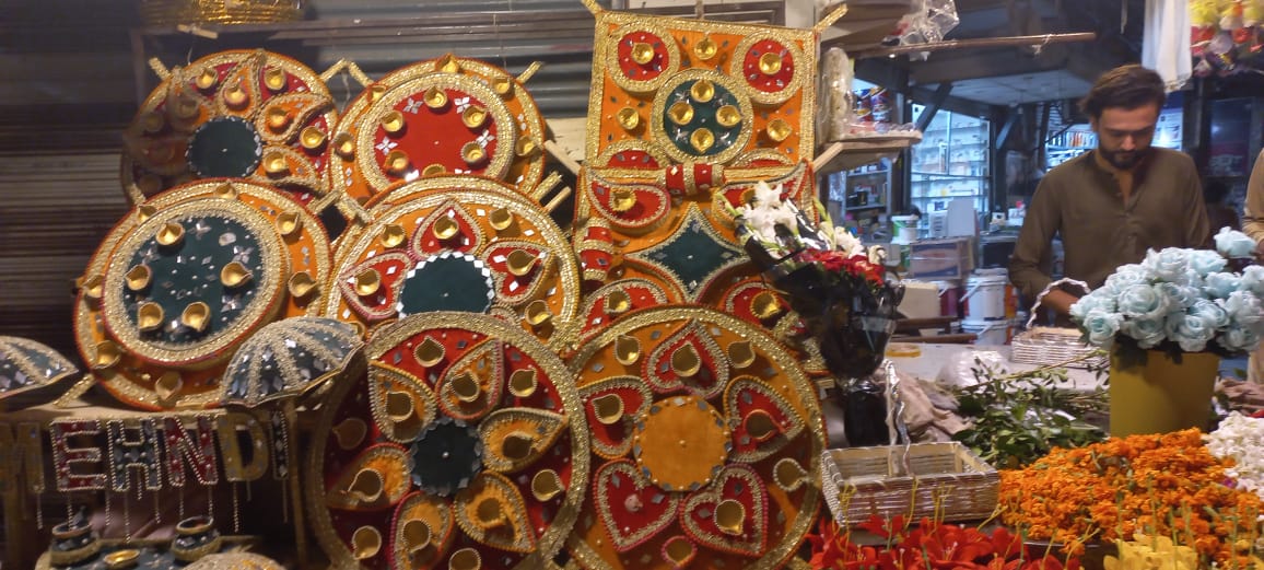 I decided to buy gift baskets and Mehndi platters that were decorated with flowers, mirrors, and golden designs. These traditional crafts looked perfect for holding mehndi, shagun items, and candles. The art was truly eye-catching, and the shopkeepers had arranged them beautifully on display.