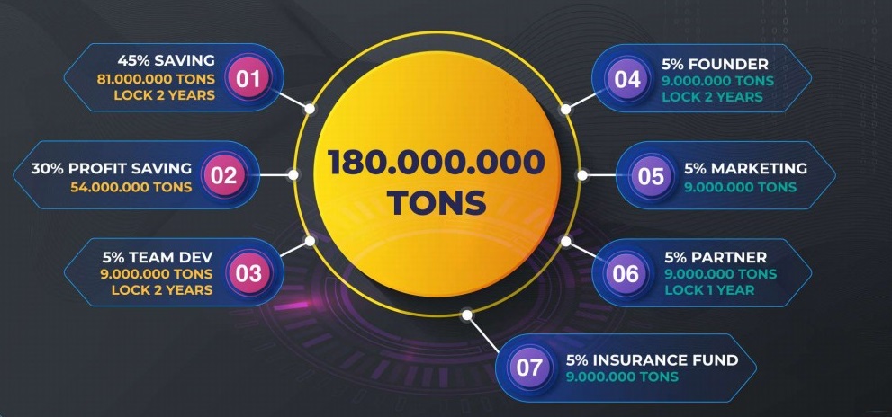 In total, the project has released 180,000,000 TONS tokens. But not all of these tokens will go into circulation immediately. Some of these tokens, 81000000 tokens, will go into circulation in the next 2 years. The initial price of the TONS token is set at $ 0.20.