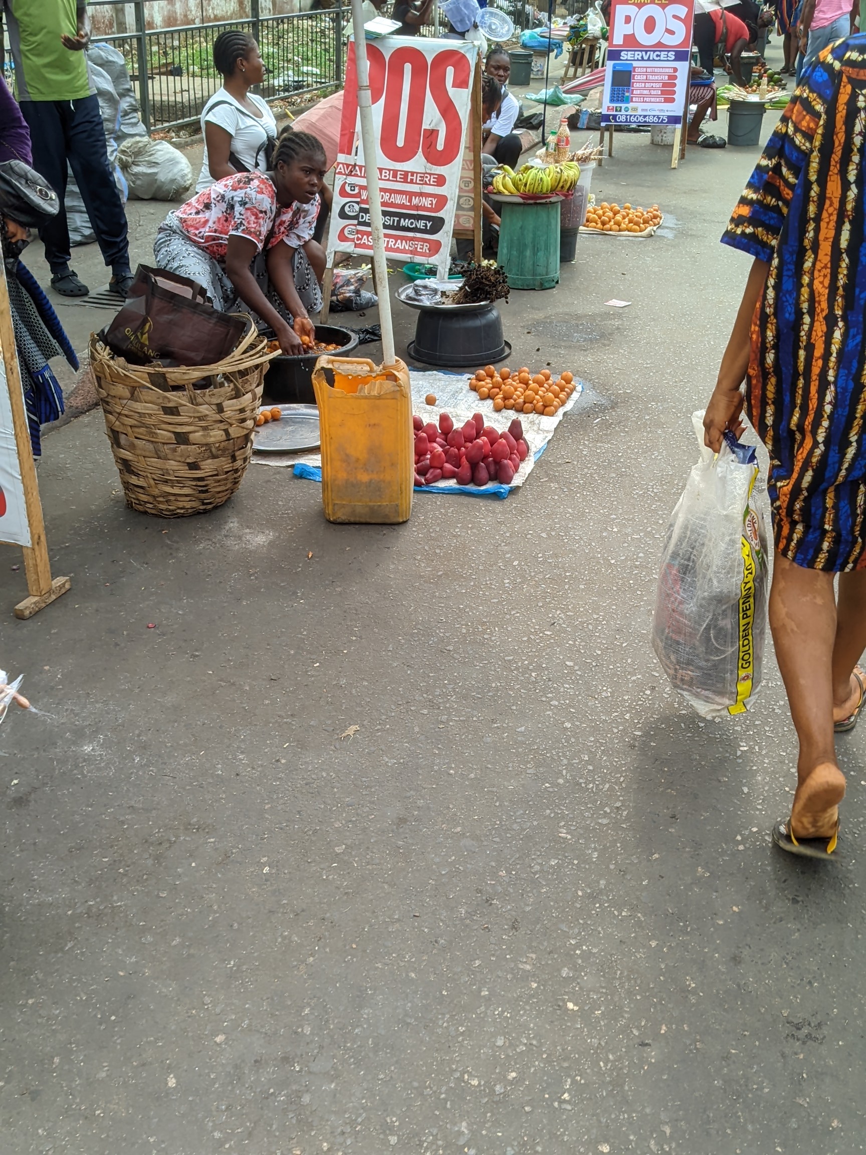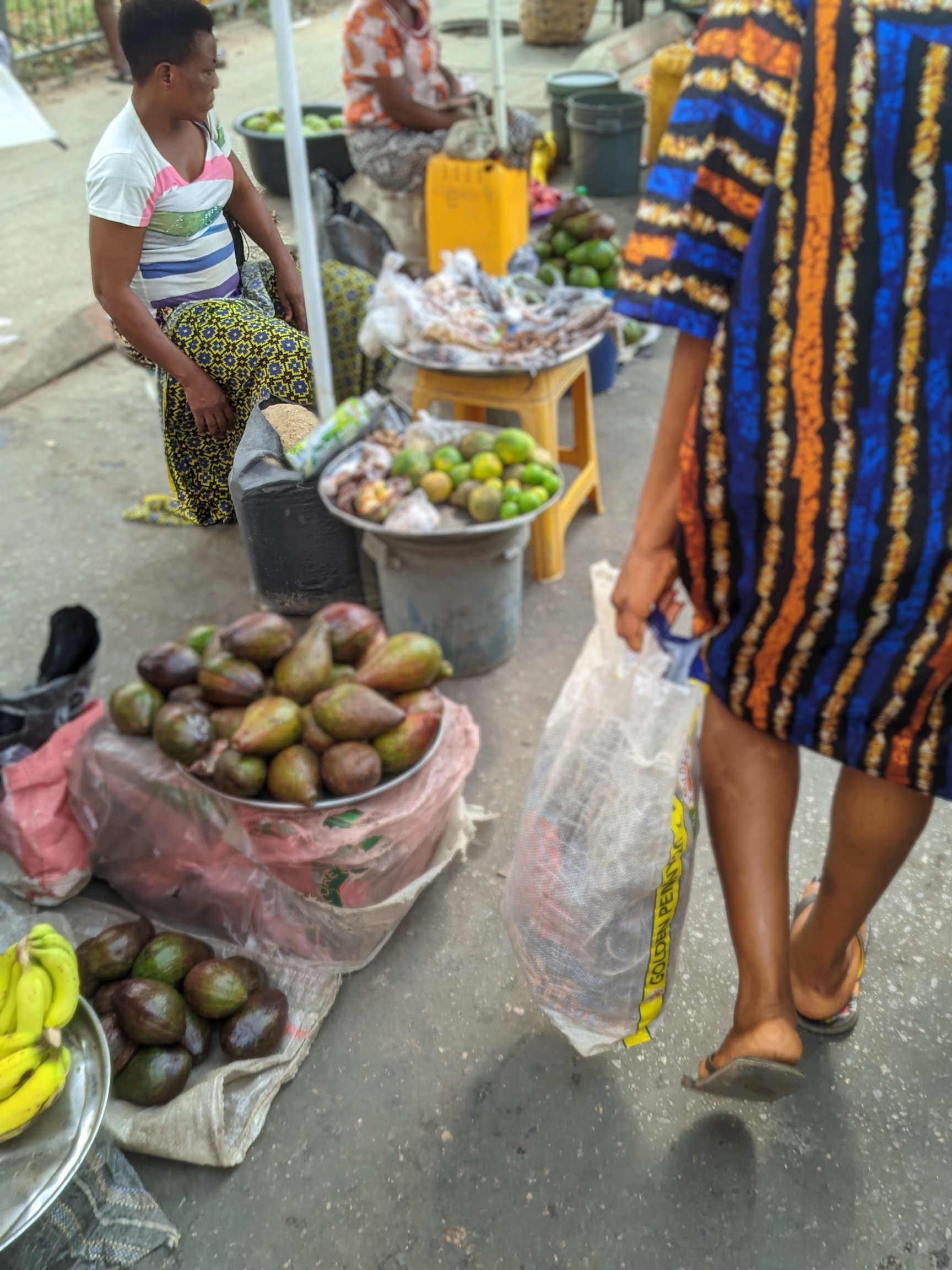 The second is pointing to another woman having a conversation with her son, probably about education since her son is in the university close to where she sells. It was of interest to me because she may be using her business to sponsor him in school. You'll also see buses lined up by the road, close to where these market women sell their honey fruits.