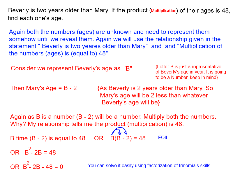 Kids can start representing Mary's Age and then find Beverly's Age by adding 2 to Mary's Age and Multiply both numbers equal to 48!!