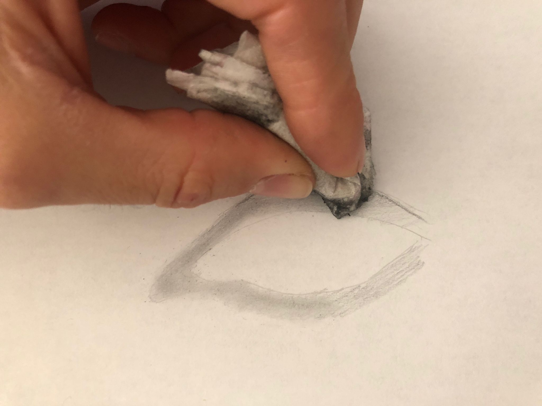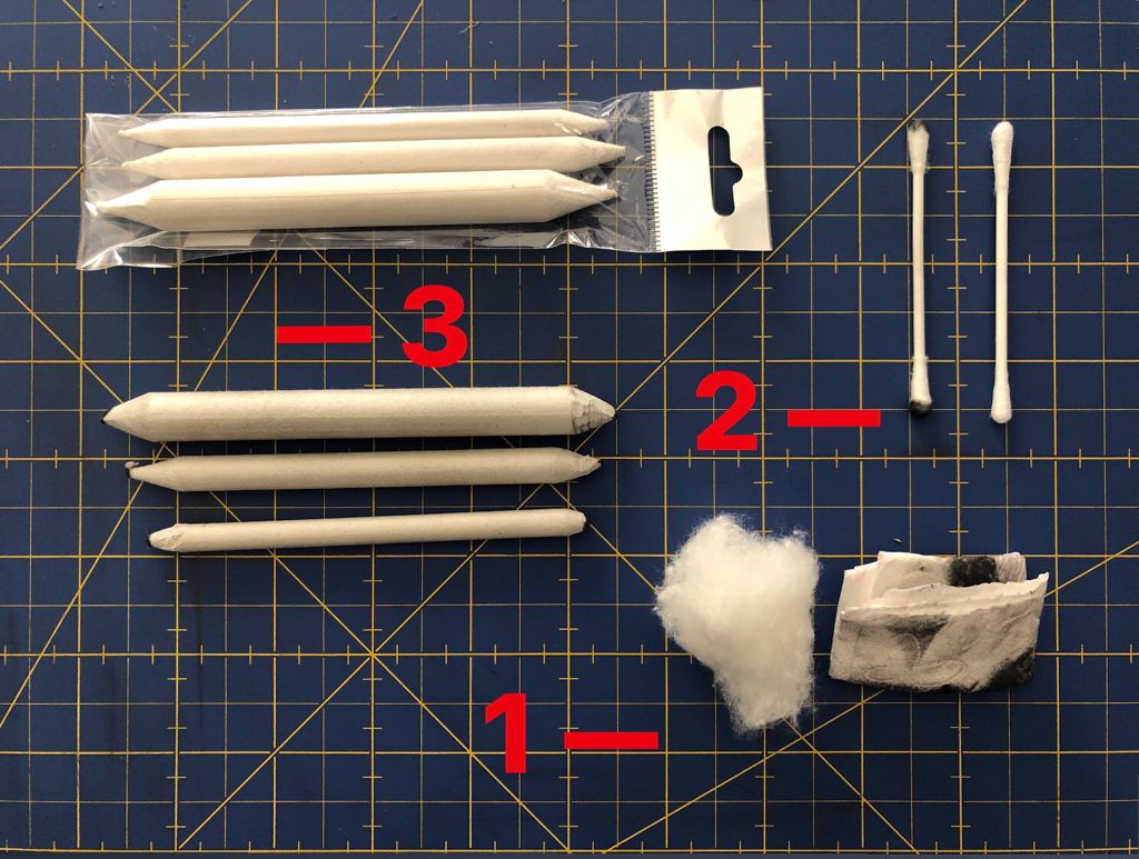 La herramienta nº1 es el algodón de toda la vida o papel de cocina. Esto lo utilizo para difuminar zonas grandes, y tonos suaves, HB, 1B, 2B. Es fácil de utilizar, doblamos el papel o el algodón hasta que consigamos que se ponga duro y utilizamos esa zona para difuminar. Viene genial para los primeros trazos.
