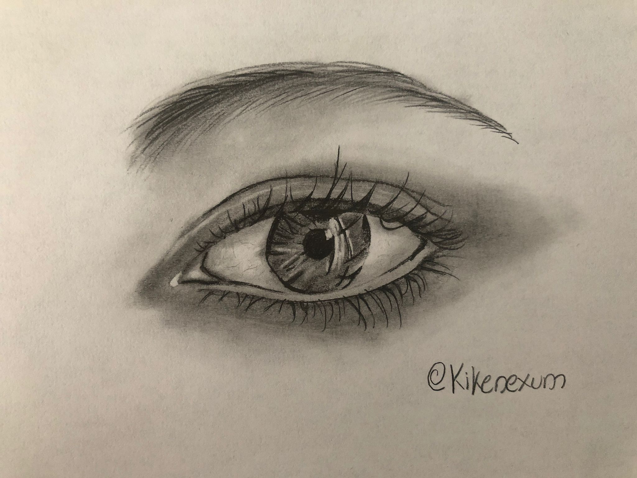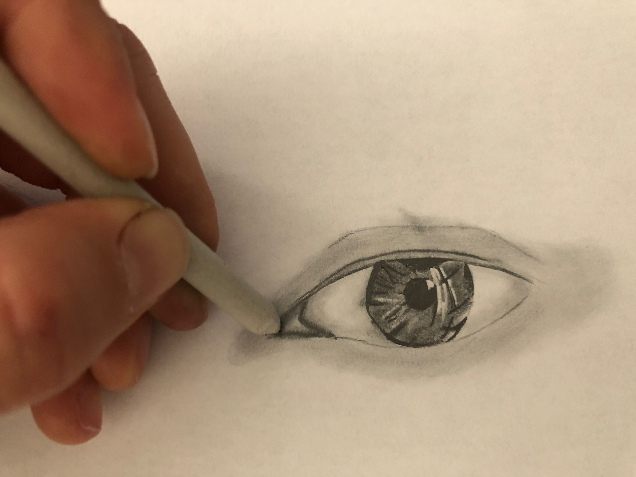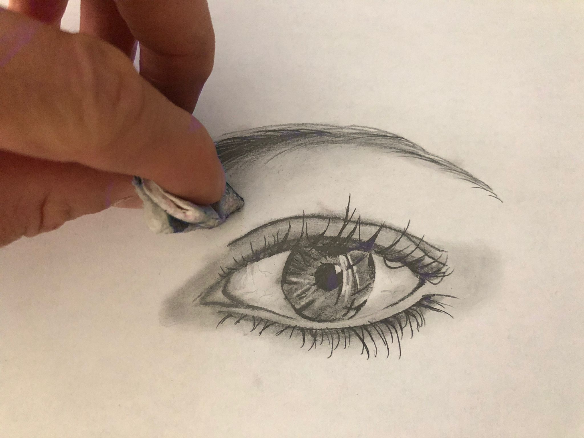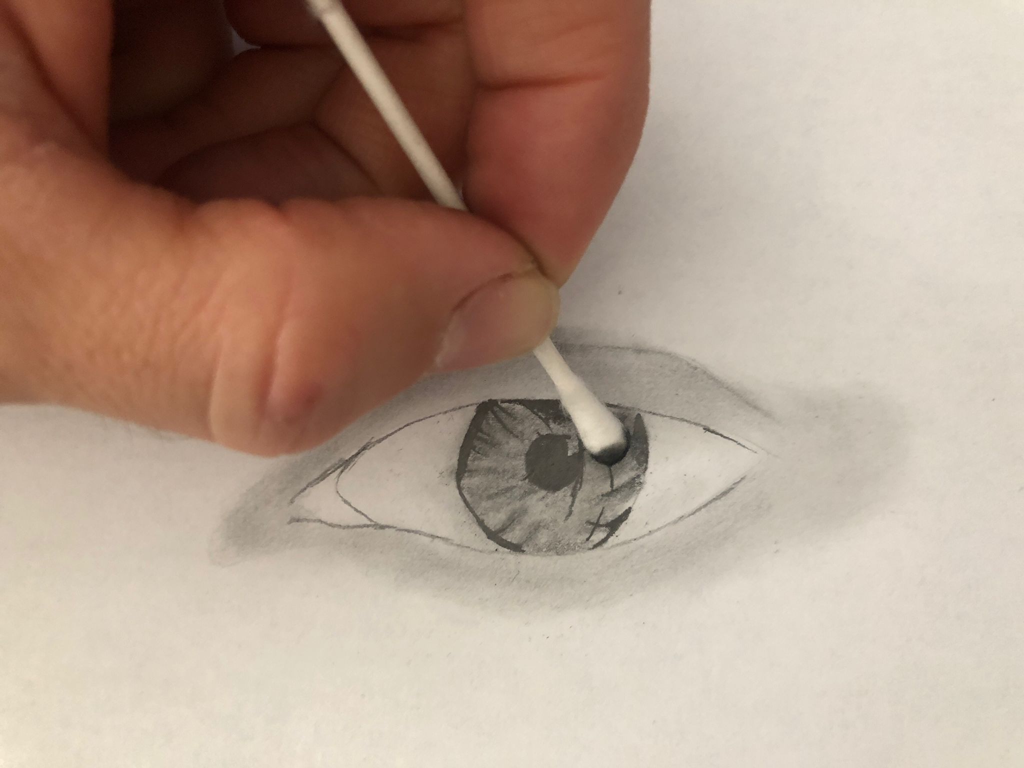 Un pequeño truco es al terminar el dibujo darle una pasada suave con la herramienta nº1 (papel de cocina o algodón), así conseguimos homogeneizar la zona aunque luego tengamos que darle de nuevo a pequeños detalles como en este caso las pestañas para que vuelvan a quedar totalmente negras.