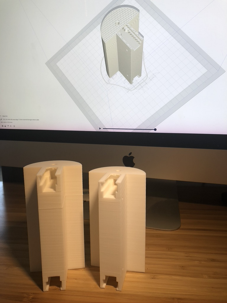 I was a bit apprehensive about this, but TinkerCAD was quite easy to learn. I also made improvements to strengthen the design of the lamp end pieces and use less plastic (shortening the print time from 19 to 13 hours)