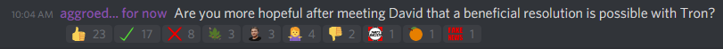 Answer: Absolutely not. As far as I could tell another company shill man. Another Yes man even though he denied it. Another corporate dog that does not understand group think group behavior, nor group dynamics. Another company man who does not know the community that follows his company, Does not know what or how the users of Tron refer to themselves, let alone how we the users of steem block chain refer to ourselves. He kept sucking up to eli powel, another company person that had no respect for the users of steem block chain. As for the start and all the ooh and aahing over andrachy, another company person that has had no respect for the people/user of steem block chain, the oh were not trying to split steem users we are here to build a new block chain that we hope to have in 6 months or so for the steem users to move to when Tron collapses the roof of the steem block chain. SO NO I have no hope at all for a beneficial resolution with Tron, I also do not believe that any thing andrachy is preaching is beneficial to Steem Block Chain.