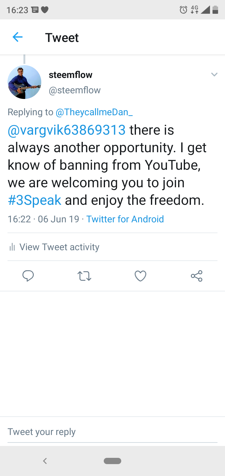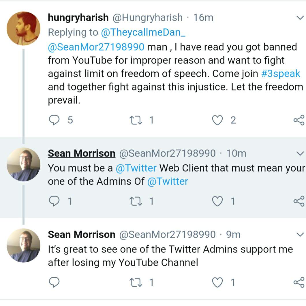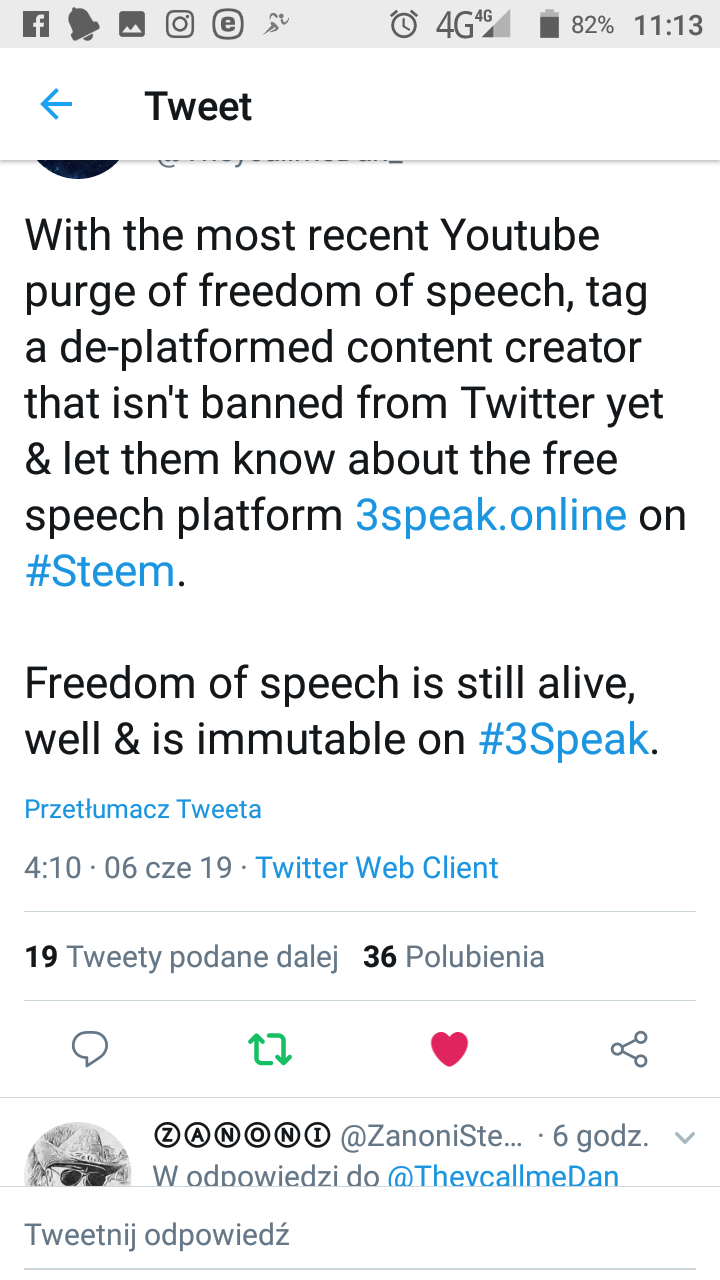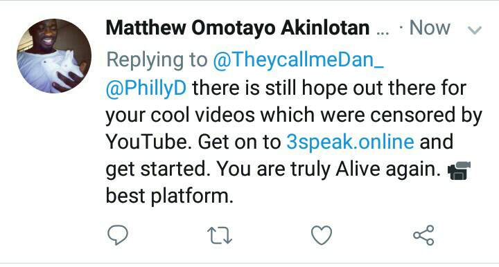 My Tweet: "With the most recent Youtube purge of freedom of speech, tag a de-platformed content creator that isn't banned from Twitter yet & let them know about the free speech platform https://3speak.online/ on #Steem.