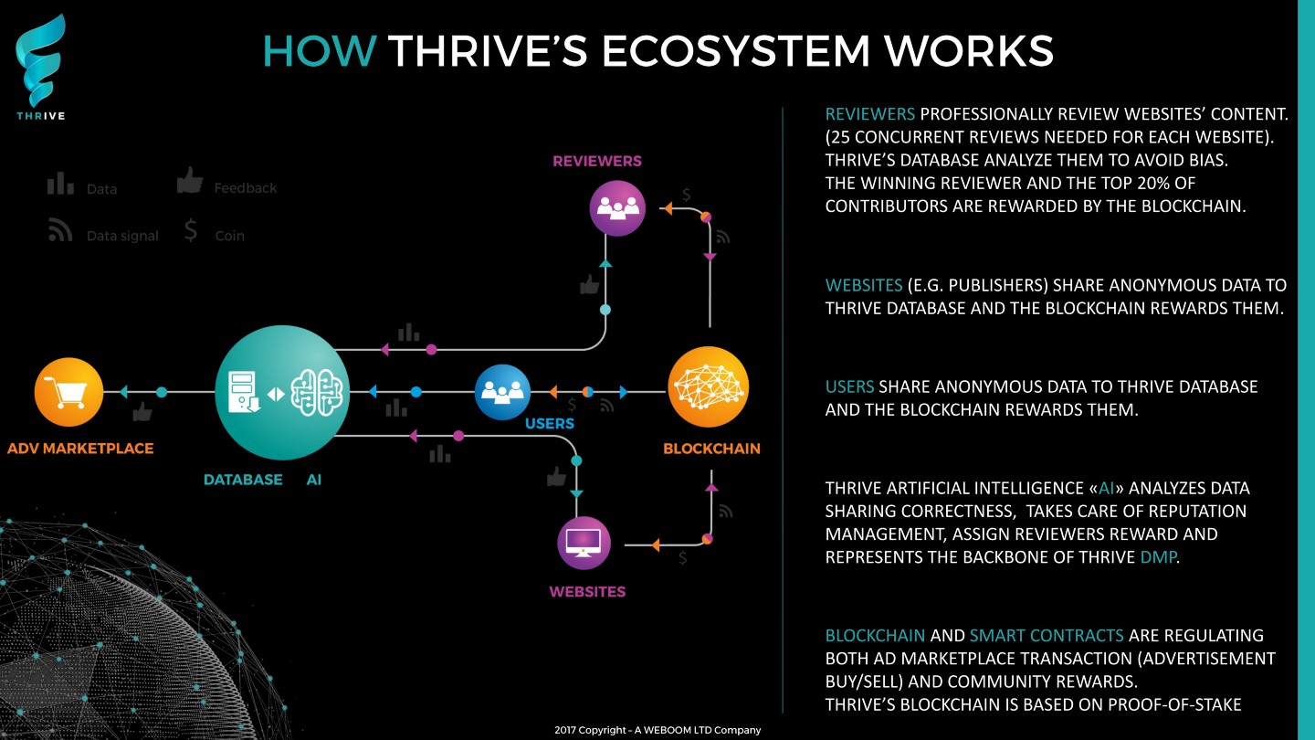 THRIVE bietet eine dezentrale Ad marketplace für premium-Marken, um Ihre anzeigen in einer Weise, die Sie mögen und auf die Inhalte, die Sie fühlen ergänzt Ihre Marken. Sie möchten, bauen Sie eine meritokratische und community-basierten ad-Markt. Die wichtigsten Teilnehmer der THRIVE-Werbe-ökosystem sind Werbetreibende, Verlage, Rezensenten und Verbraucher.