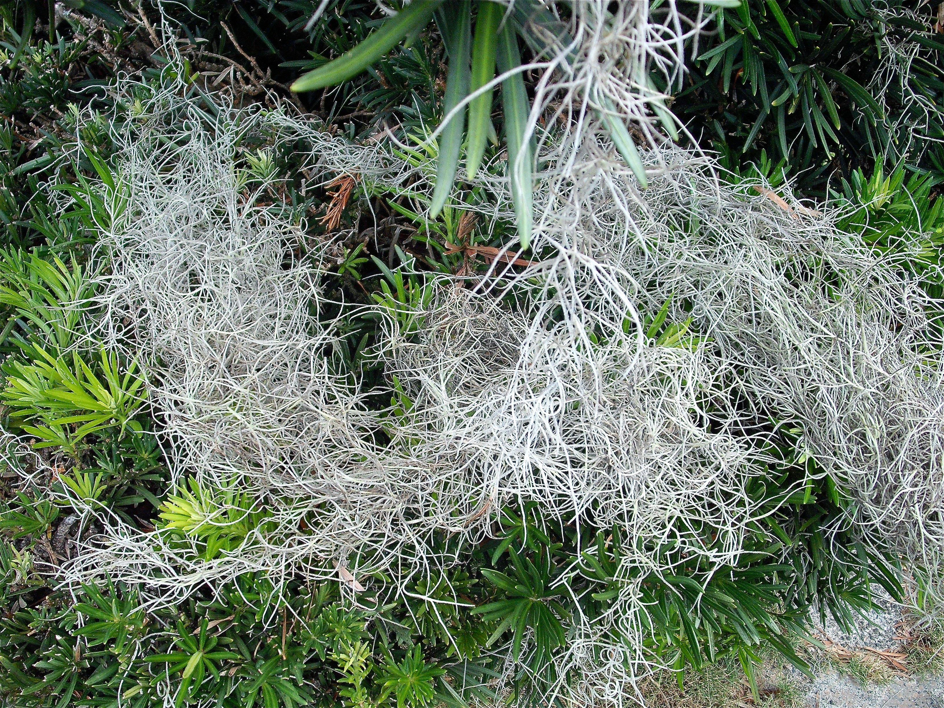 This plant's specific name usneoides means "resembling Usnea", and it indeed superficially resembles its namesake Usnea, also known as beard lichen, but in fact Spanish moss is neither a moss nor a lichen. Instead, it is a flowering plant (angiosperm) in the family Bromeliaceae (the bromeliads) which grows hanging from tree branches in full sun through partial shade. Formerly this plant has been placed in the genera Anoplophytum.