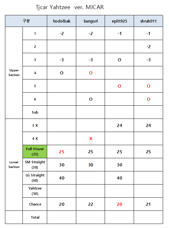 1차 5개 주사위의 결과와, 고정할 주사위, 다시 던질 주사위를 댓글에 표시해 주세요.