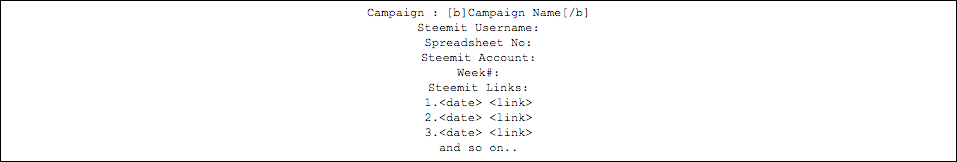 - Every week, submit the list of posts/resteemes in the thread* using the following format: