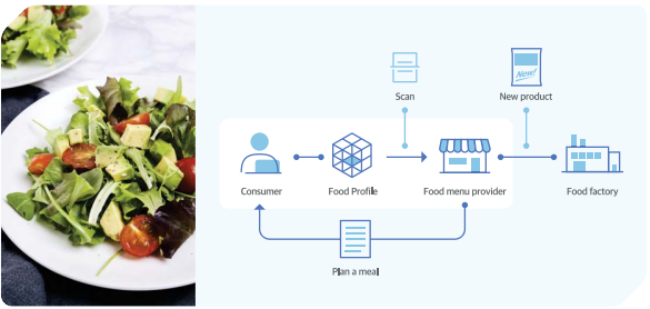 소비자는 개인의 건강 상태에 따른 데이터를 푸드 프로필에 저장 가능하며, Hint chain에 등록된 전문 식잔 업체에 본인의 요구사항을 공유하여 증상에 맞는 식단을 제안 받을 수 있다.