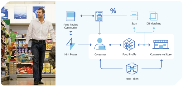소비자는 Wallet의 HintPower로 상품을 결제하며, 얻게된 상품의 리뷰를 Hint Dapp을 통해 등록하여 푸드 프로필을 최신화 한다.