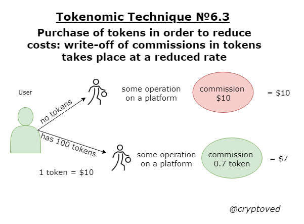 The user incurs certain costs in the system, but he can reduce them by buying tokens. It would seem that this is a fairly simple mechanism and in the public sense it can be compared with a discount card. The freedom of tokenomic functionality allows us to use this technique in more diverse forms.Consider examples of cost reduction. In this technique, for each case, we will also draw up our own scheme to more clearly distinguish one variation from another.