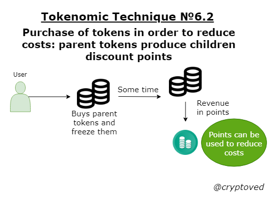 This is a more complicated case, here we have two types of tokens. Parent tokens can be bought and frozen and they will periodically serve as a trigger for the issue of discount tokens. For example, we froze 100 parent tokens. At the end of the month, we accrued profitability, but it happened in separate tokens that can already be spent on reducing the purchase amount. In the system, we will call such tokens points. The point rate can be tied to a stable coin or other calculation currency in the system. Something similar can be observed in the Tron’s ecosystem, when the long holding of a certain number of TRX makes transactions free of charge due to the accumulated energy.