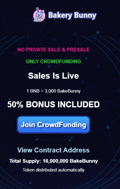 Telegram: https://t.me/BakeryBunnyFinance https://t.me/BakeryBunnyFinanceRoom