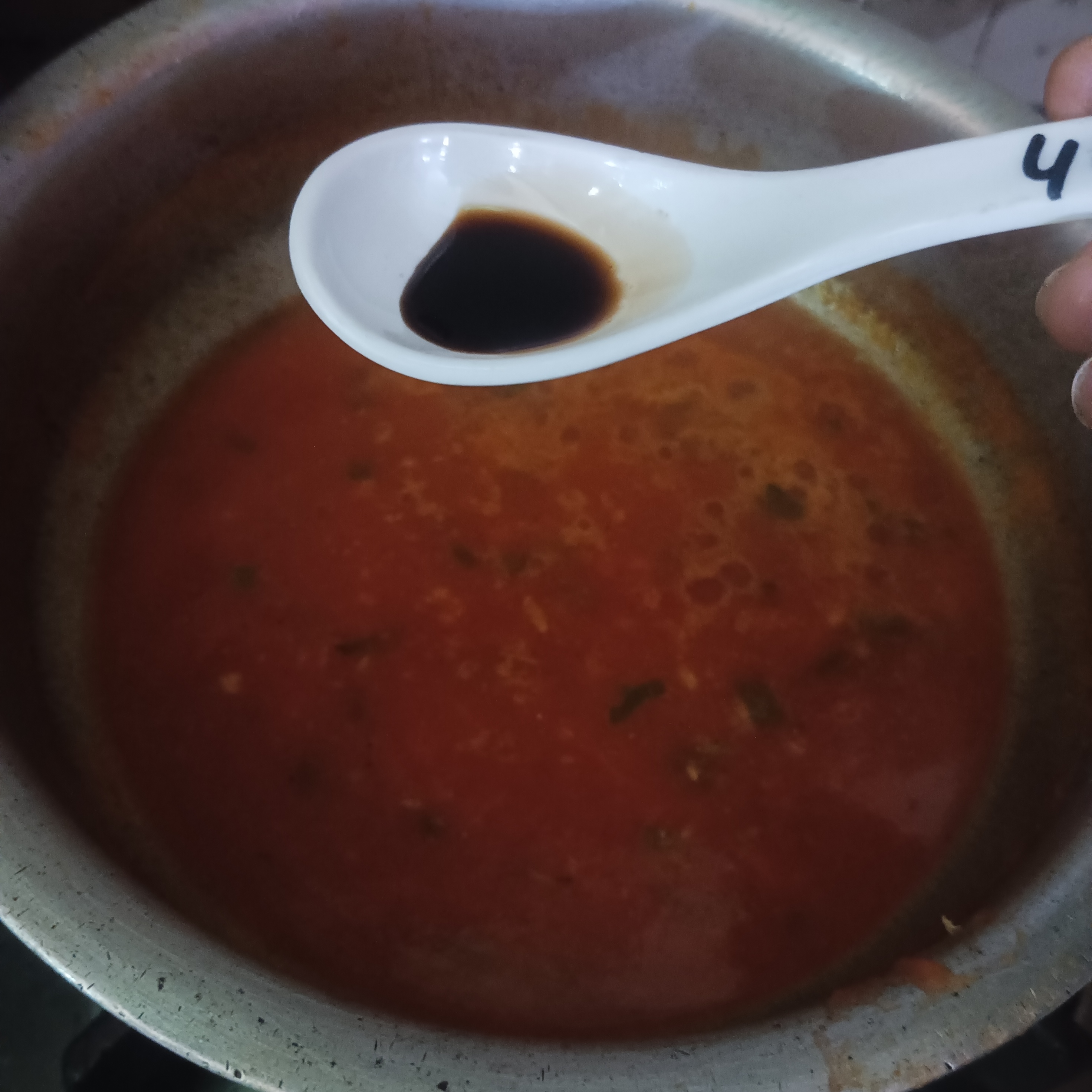 - For developing taste of soup we will add in soya sauce, chilli sauce and chicken powder. Then again stirring it with the spoon. And keep the flame low. If the tomatoes are acidic then we can add ¹ tsp sugar for the avoiding the sour taste of soup.