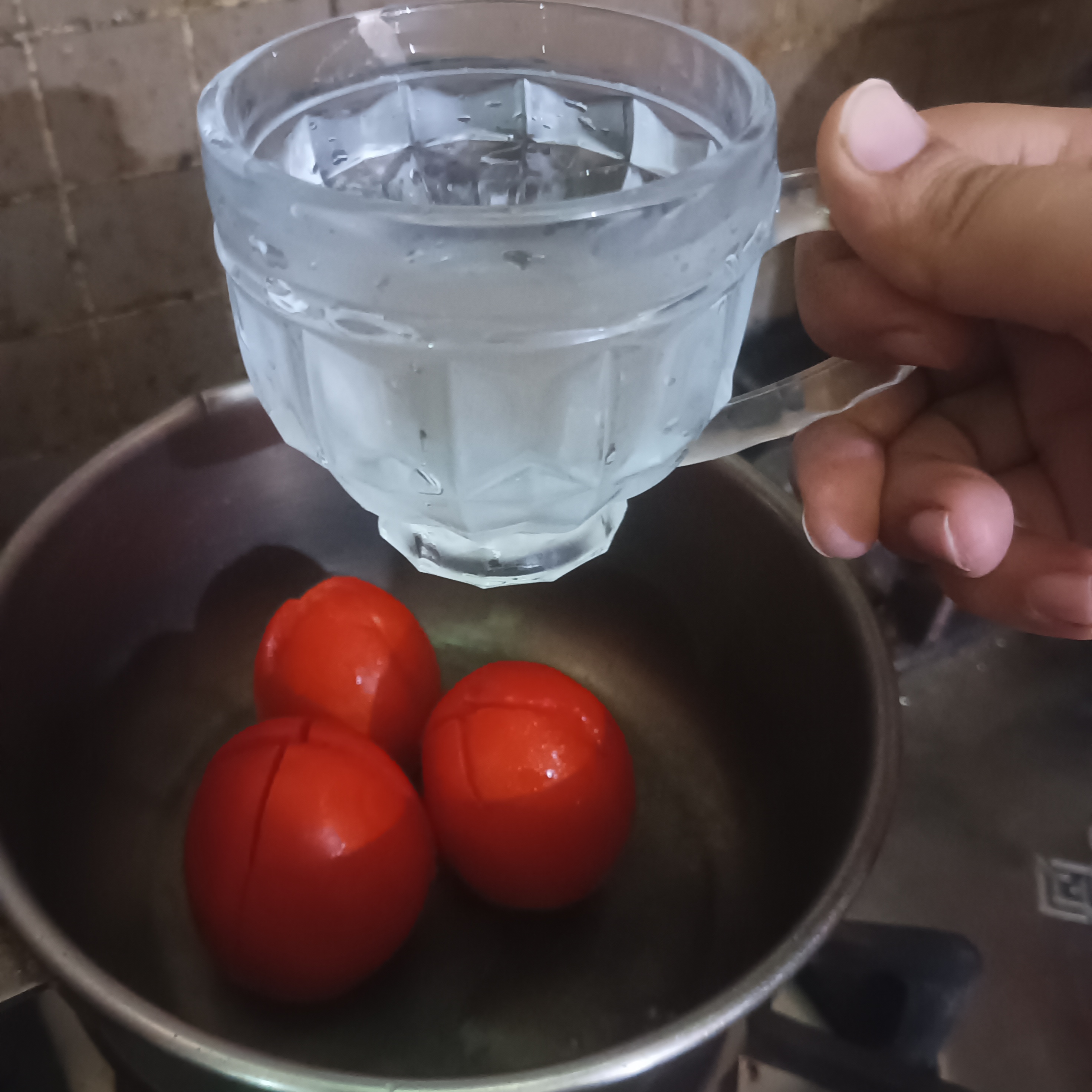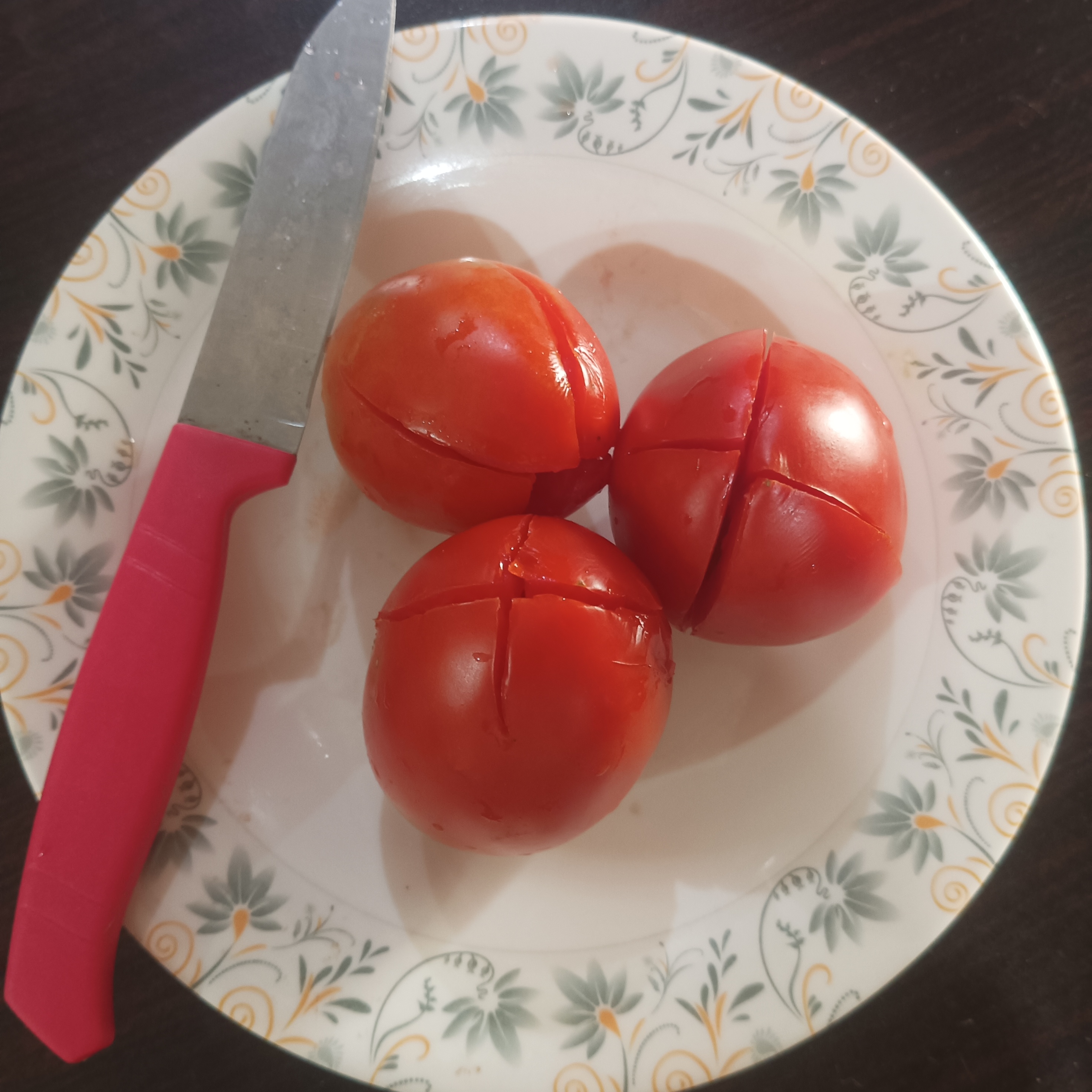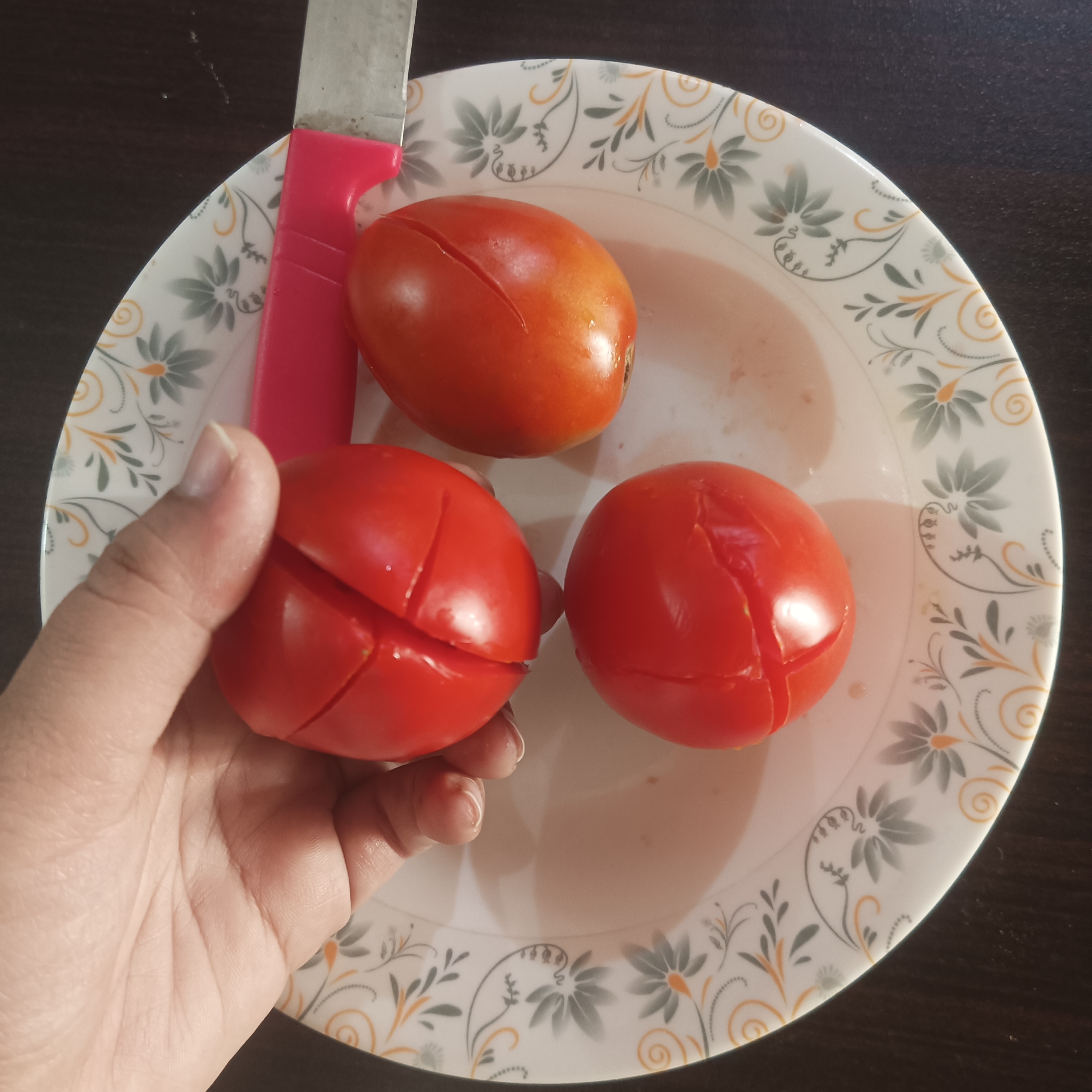 - I have taken three medium size tomatoes. I washed it with the fresh flowing water then then cut then the hard parts and stems of it. Then I put the three gashes inside the tomatoes by using sharp corners of the knife .