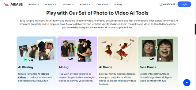 AI Ease makes it faster than ever to create fun and energetic videos. There are no video editing skills required; upload, select your preferred dance effect, and generate an eye-catching video in seconds. Your animated images will be shared simply across all your social media accounts, whether TikTok, Instagram, or YouTube. Start creating now and watch how your images come to life with a simple, fun twist!