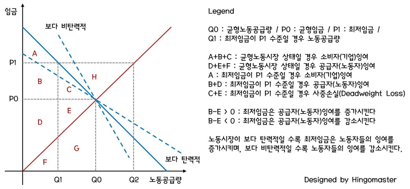 그렇다면 여기서 B와 E의 상대적인 크기를 생각한다면, 우리는 최저임금 상승의 효과를 파악할 수 있다. 그러나 B와 E의 상대적인 크기는 수요곡선의 기울기에 따라 달라질 수 있다는 점이 문제이다. 즉 노동시장의 수요탄력성이 최저임금제의 효과를 결정하게 되는 가장 중요한 변인이 되는 것이다. 아래 그림을 보면 더욱 명징하다. 보다 비탄력적인 시장일 경우, H로 대표되는 실업도 감소하고 노동자에게 이전되는 잉여인 B의 면적도 크게 늘어난다. 반대로 보다 탄력적인 시장일 경우, 정반대의 효과를 가져온다.