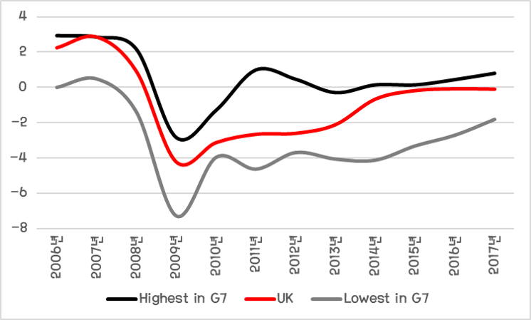 이 0.9%p 라는 숫자는 작아 보이지만, 2017년이 전 세계 모든 국가가 경기가 좋았던 해라는 사실을 잊어서는 안 된다. 당장 G7 내에서 비교를 해 보더라도 영국은 G7 내에서 3분기까지의 누적 GDP YoY 성장률이 꼴찌를 기록하여 그 답 없는 이탈리아에게도 졌다. (출처 : IMF) 더 큰 문제는 다른 모든 선진국들이 경기가 반등할 동안 the Referendum 이후 혼자서 경기가 줄줄 흘러내리고 있다는 점이다. 그럼 왜 이런 일이 발생하였는가? 문제는 크게 '비용인상 인플레이션' 과 '민간투자 축소' 로 구분할 수 있겠다.