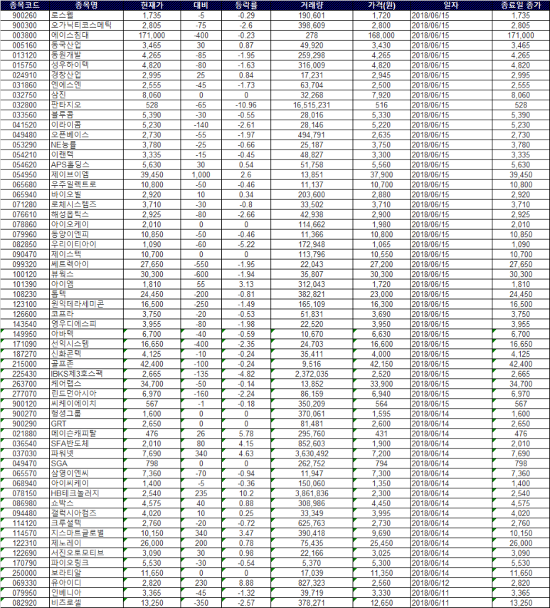 6월 3주차 52주 신저가 리스트tolany (51)in #tooza • 8 years ago 6월 3주차 52주 신저가 우선 현대차2우B가 가장 먼저 눈에 들어옵니다. 한화케미칼, 코리아오토글라스 등도 이름을 올렸습니다. 코스닥에서는 특별히 관심이 가는 종목은 없어보입니다. KOSPI 52주 신저가 리스트, KRX MARKET DATA KOSDAQ 52주 신저가 리스트, KRX MARKET DATA #kr #investment #krwhale #jjangjjangman