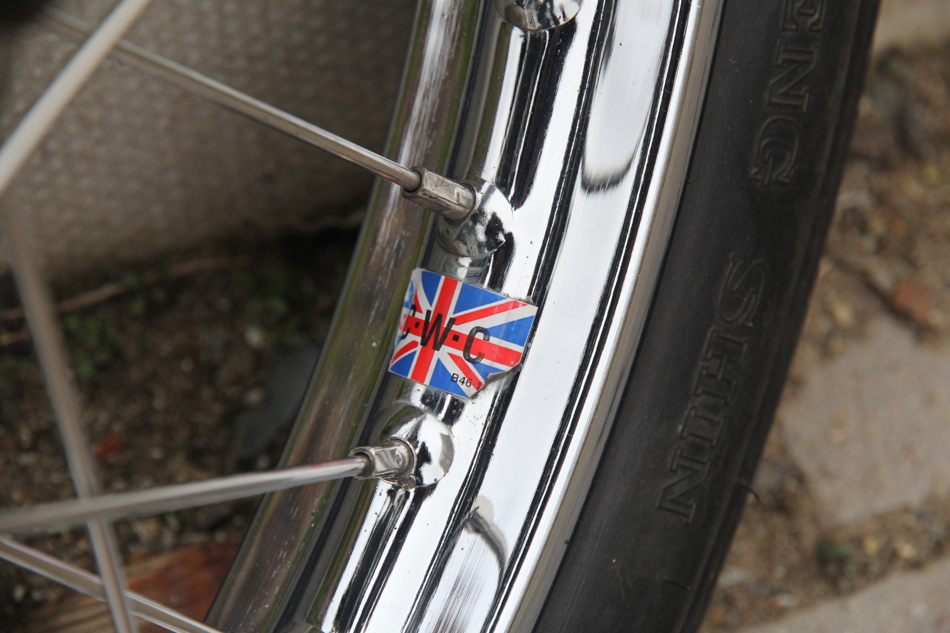 The wheel rims are far gone and beyond repair so new ones are ordered and rebuilt with stainless steel spokes so rust won't be a problem in the future. Ugly sticker yet to be removed.