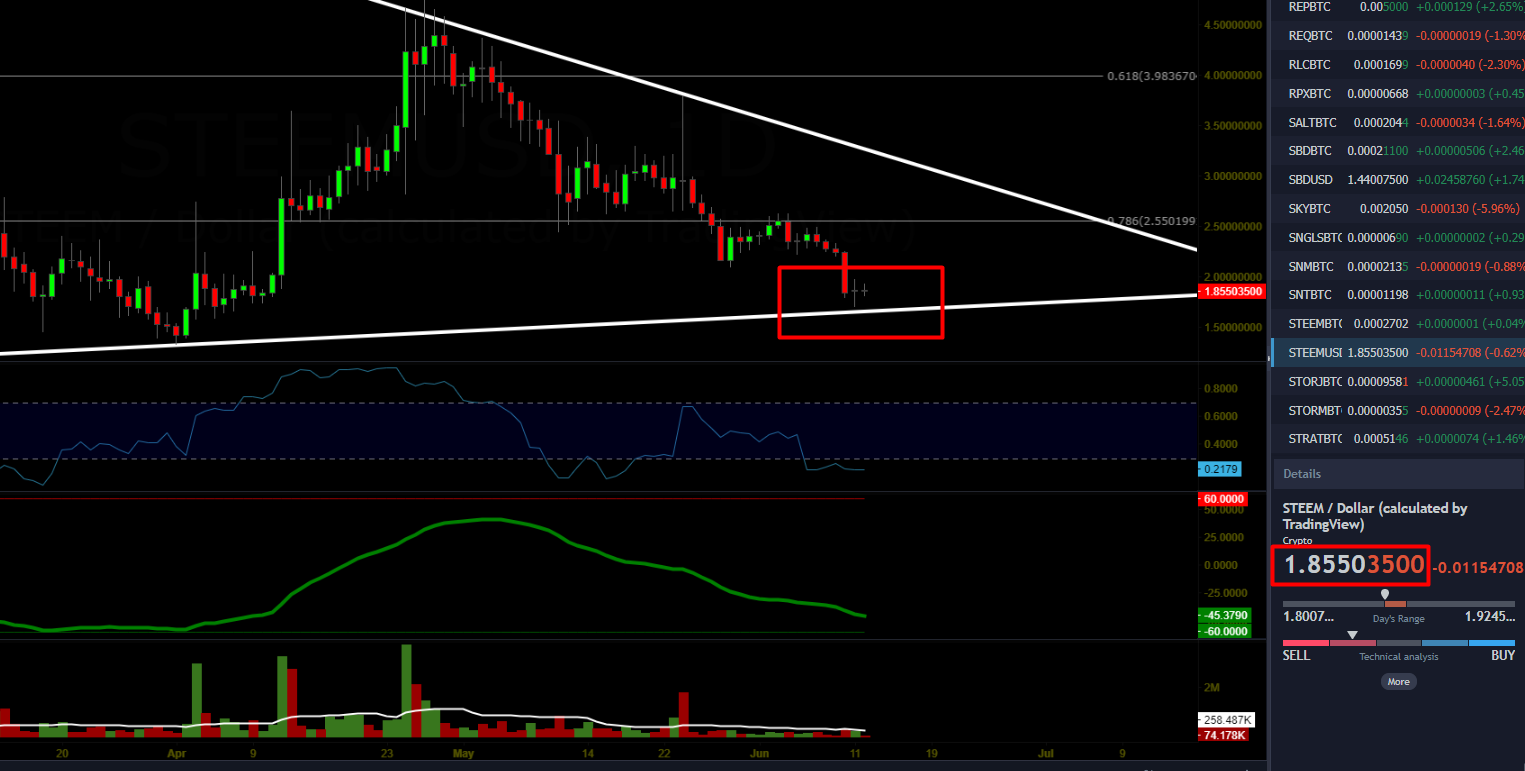 Teknik analiz anlamında baktığımızda ise Steem'i şu anda desteğe sırtını yaslamış olarak görüyoruz. Eğer desteği aşağı yönlü kırmazsa önümüz açık. Daha önceden Steem'in 2 dolar altına ineceğini düşündüğümü söylemiştim. Bitcoinin ani yükseliş ve düşüşleri bizi muallakta bıraksa da şu anda beklediğim seviyelerden işlem görüyor.