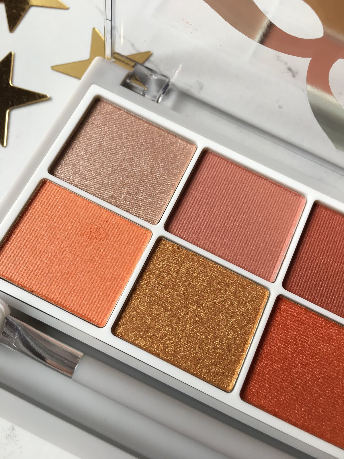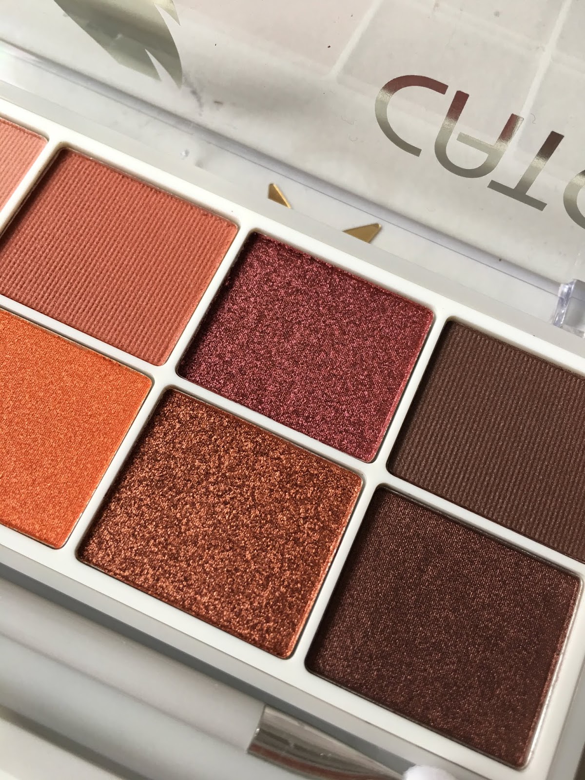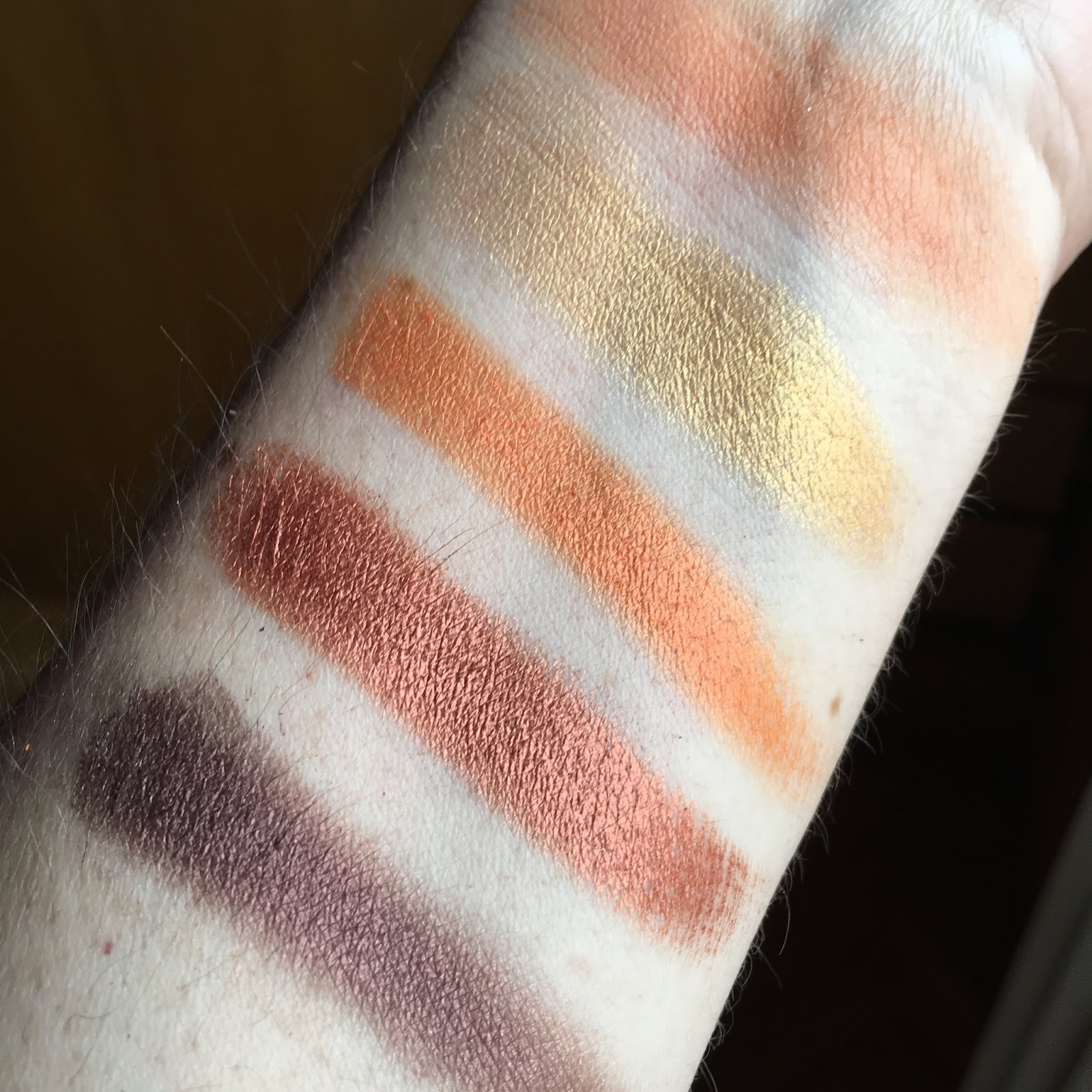Ortadaki turuncu da inanılmaz bir renk, sedefli ve parlak ama çok pigmentli değil. Zaten bütün palet orta pigmentli renkler öyle patlamıyor. Ama renkler "buildable" yani kat kat arttırılabiliyor ve çok kalıcılar.