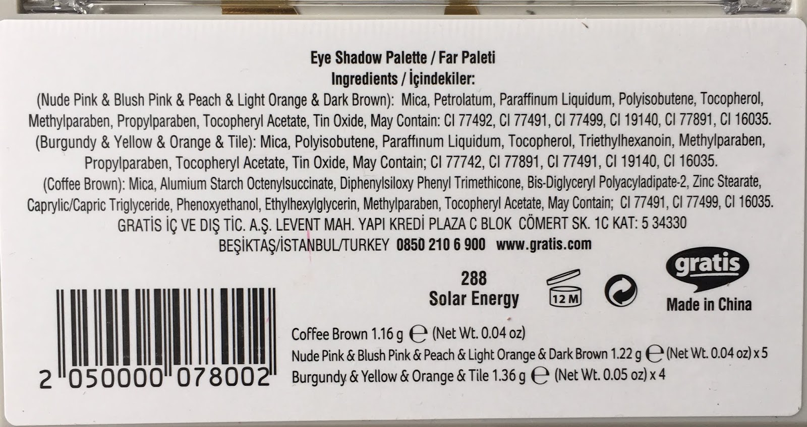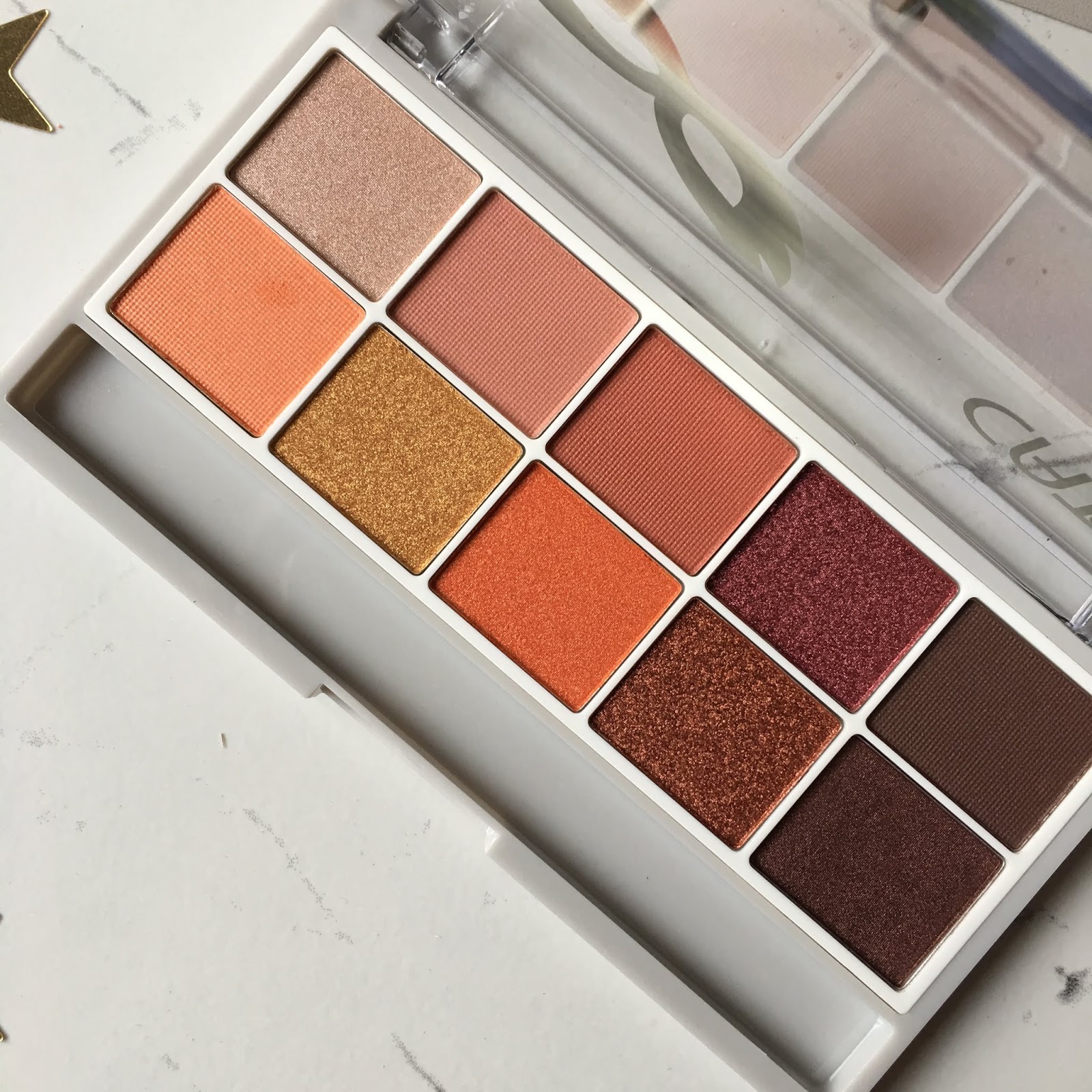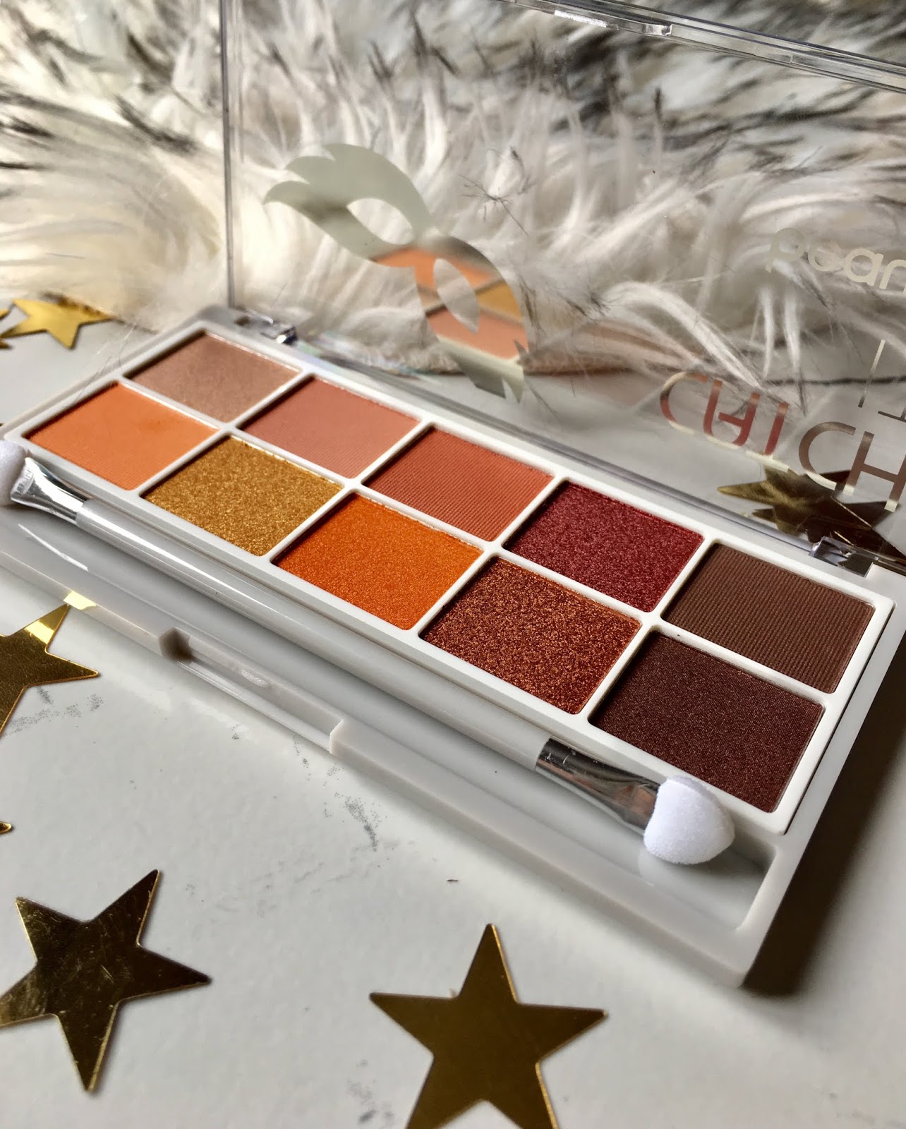 Ortadaki turuncu da inanılmaz bir renk, sedefli ve parlak ama çok pigmentli değil. Zaten bütün palet orta pigmentli renkler öyle patlamıyor. Ama renkler "buildable" yani kat kat arttırılabiliyor ve çok kalıcılar.