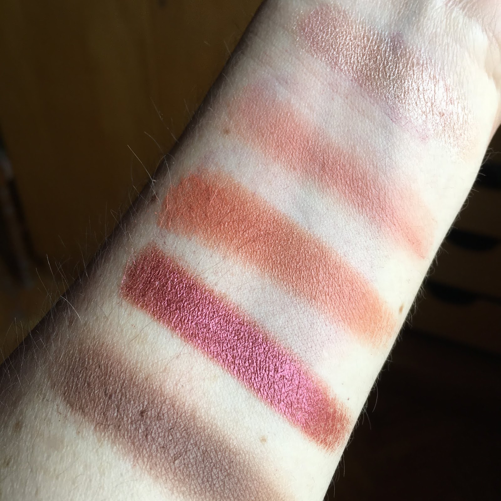 Üst sıranın swatchları. Bu arada en üstte gördüğünüz renk aynı zamanda nefis bir aydınlatıcı, yani tek palette bir de aydınlatıcınız oluyor.