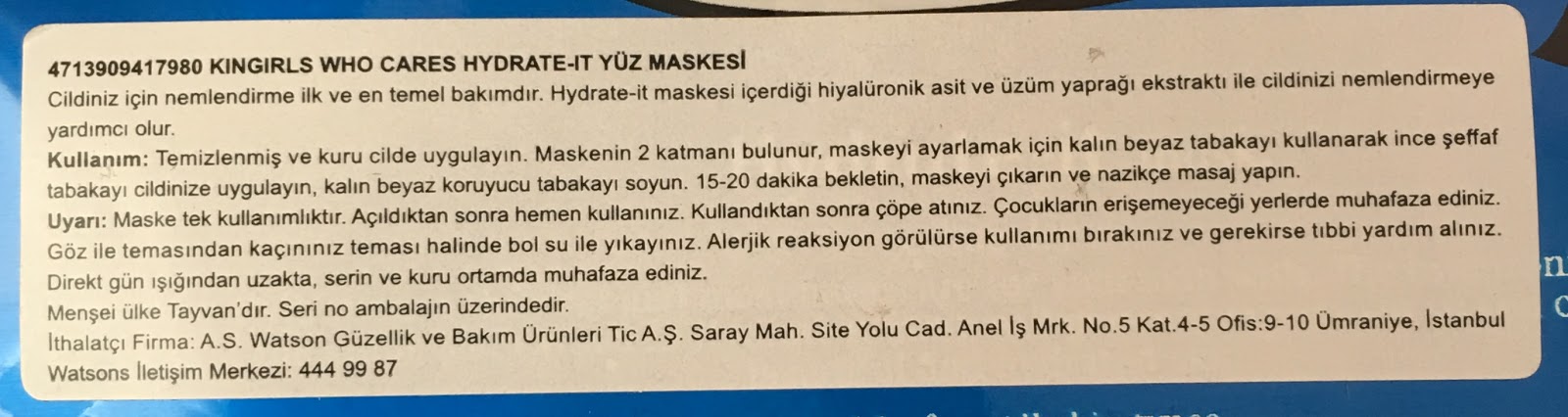 Kingirls Tayvan kökenli bir güzellik markası ve Who Cares? serisinden başka değişik maskeleri de var. Watsons'ın diğer serileri de getirmesi çok iyi olurdu bence.