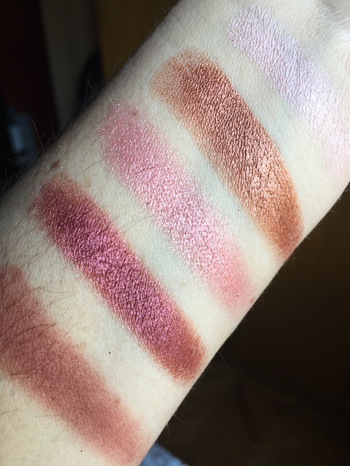 Alttaki iki aydınlatıcıya gelirsek, özellikle açık renkli olanın yapısı kalın ve yumuşak, parmakla aldığımda parça parça geliyor ele. Koyu renkli olan da hemen hemen aynı ama daha az parçalanıyor. Neyse ki fırçaya o şekilde parça parça gelmiyor. Tapered tarzı hafif sivri uçlu bir aydınlatıcı fırçası öneririm size bunun için. Ben genelde iki rengi karıştırıp alıyorum. Simli değiller, çok yaldır yaldır metalik de değiller ama buradayım diyor yine de. kalıcılığı kesinlikle orta seviyede, daha yoğun bir parlaklık için gün içinde bir tazeleme istiyor.