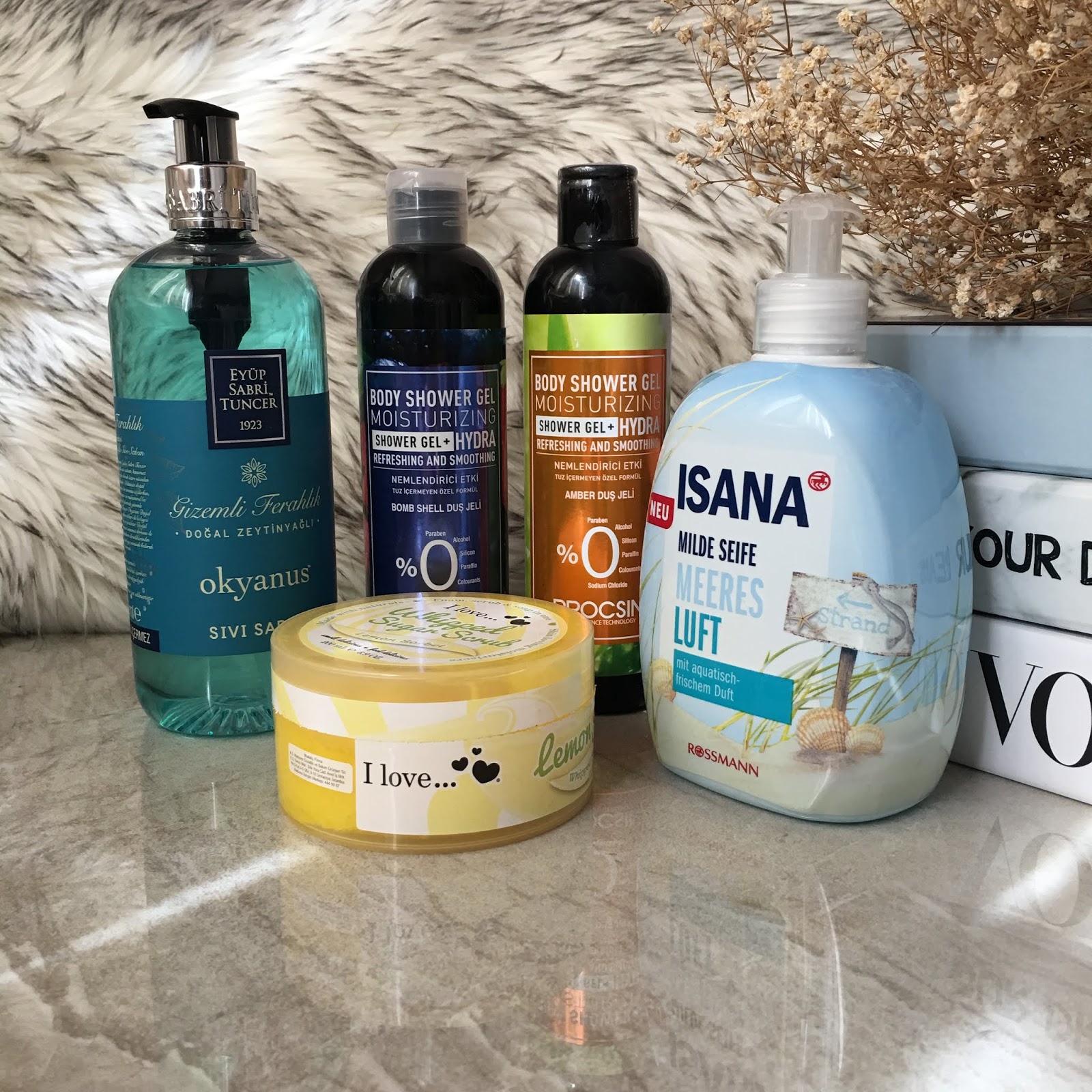 2 al 1 öde kampanyası ile Procsin duş jelleri, ve EST'in okyanus kokulu sıvı el sabunu aldım. Bunlar ayrı yerlerden yalnız, duş jelleri Watsons, sabun Tedi'den alınma. Her zamanki gibi bir de Isana sıvı sabun almadan duramadım. Watsons'dan bir de vücut peelingi aldım ama hem kokusu kötü hem de peeling olarak çok zayıf, daha çok duş jeli gibi kullanacağım.