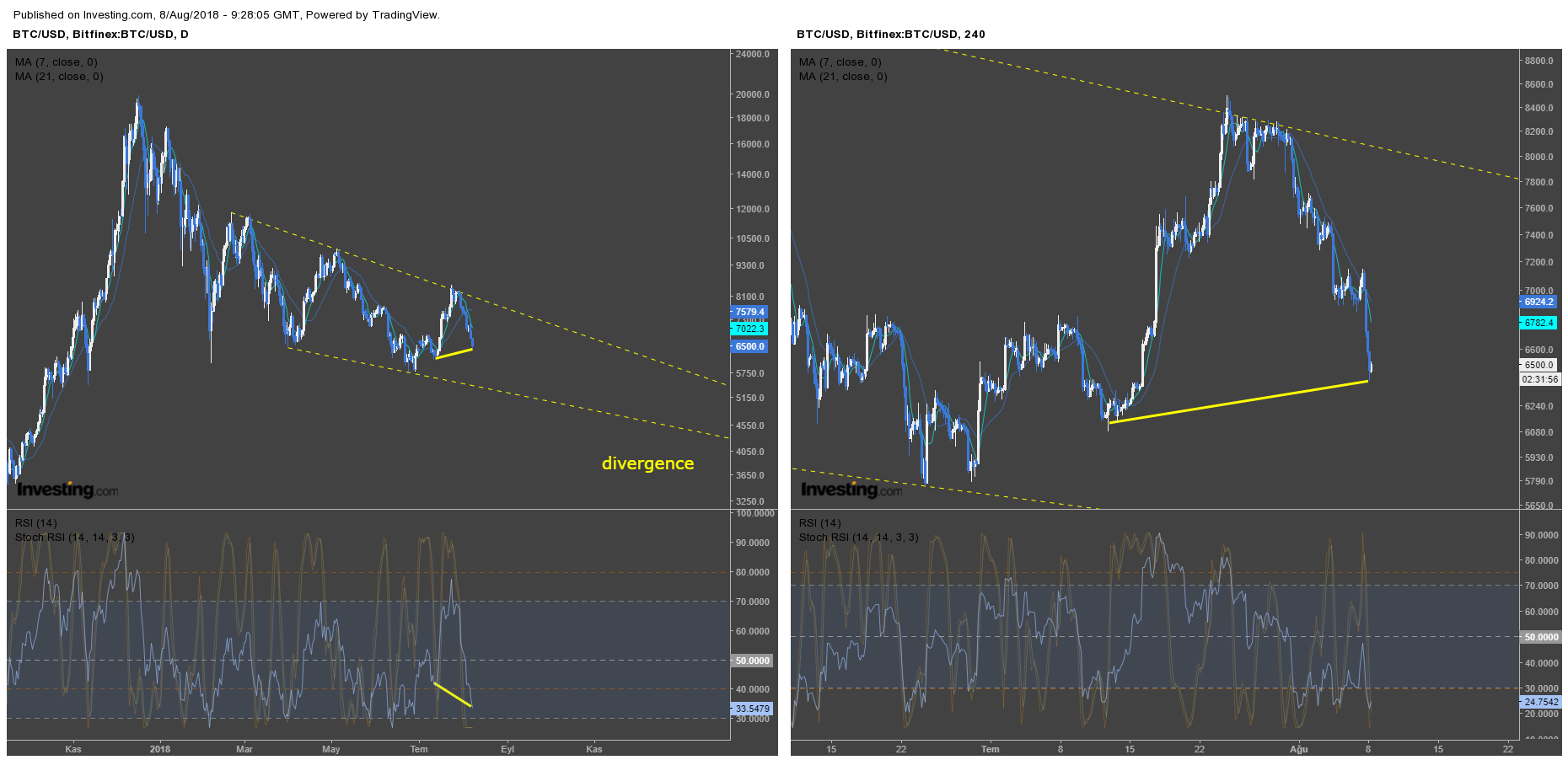 Fiyat 6075$ altına sarkmazsa, uyuşmazlık çalışır ve en azından kısa sürede 7000-7500$ bandını görebiliriz. Günlük grafikte RSI'ı incelediğimizde de, aşırı satım bölgesine yakın seyrediyoruz. Bir miktar daha satış görebiliriz.