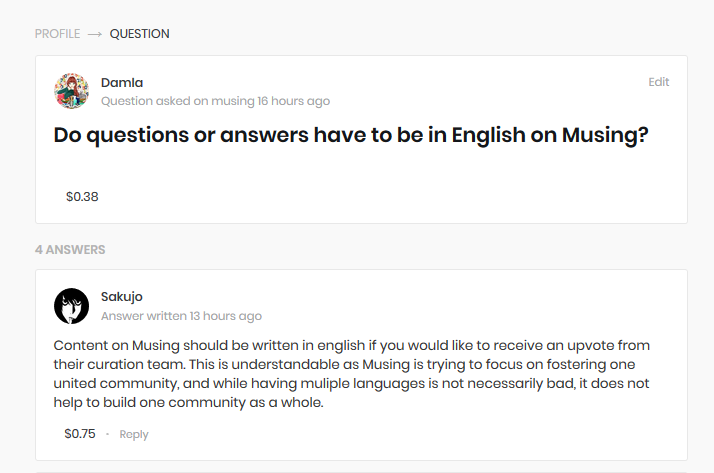 Musing.io küratörleri kaliteli soruları veya cevapları seçip belirli oranda oy atmaktadırlar. Şu anda sadece kaliteli ingilizce sorular ve cevaplar @musing hesabından oy desteği alıyor. İleride bu durum belki değişebilir. Musing yeni ve gelişmekte olan bir proje olduğundan şu anda bu konuda kesin bir şey söylemek mümkün değil.