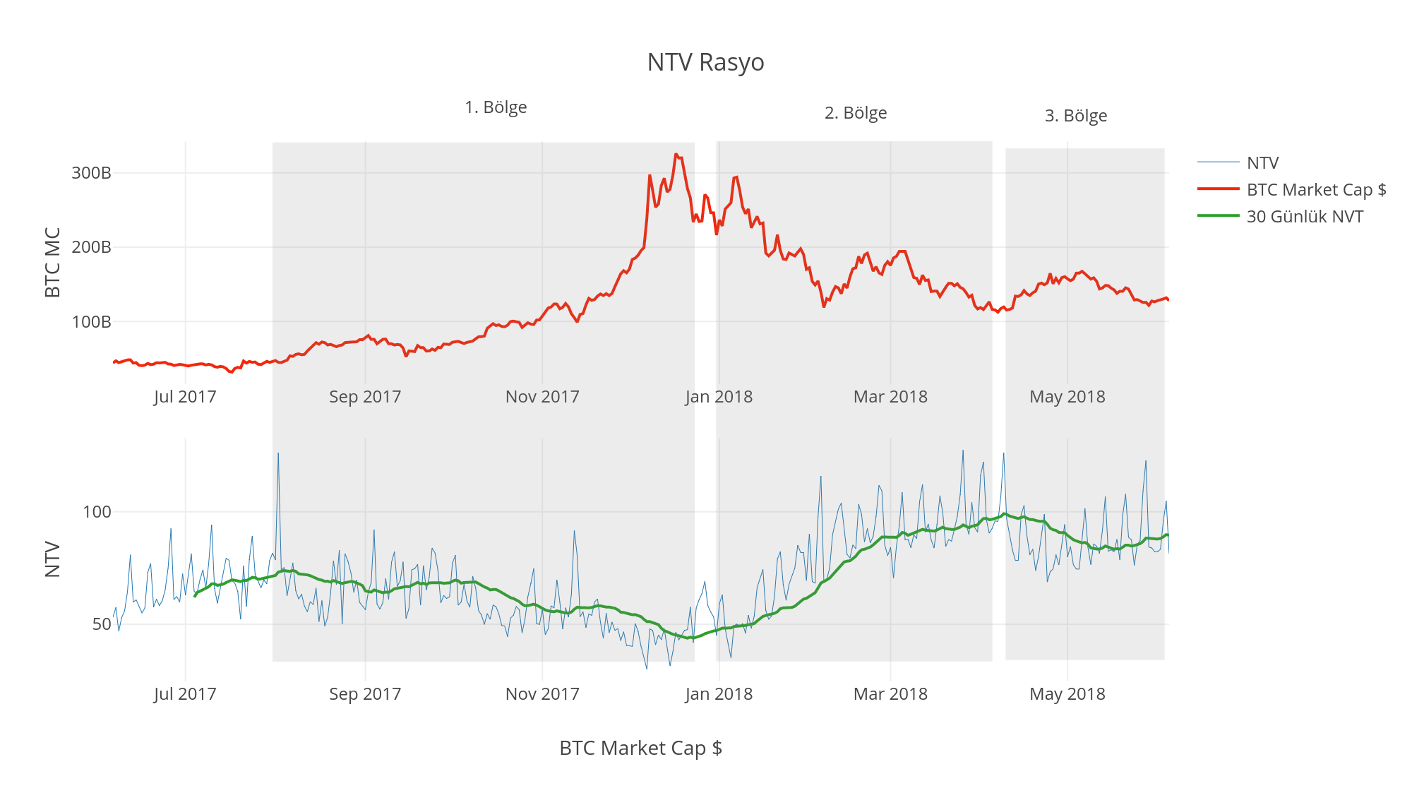 BTC market cap azalışa geçerken, NTV oranı yükselmiş. Yani hem market cap hem btc kullanım değeri azalmış; ancak kullanım değeri market cap için daha çok azalmış ki NVT oranı azalmış. 1. bölge de yaşanan aşırı talebe bir tepki gelerek bu sefer talepte ciddi bir azalma olmuş. Talep azalırken NTV 100 birime yaklaşmış ve fiyat fazla değerli kalmış.