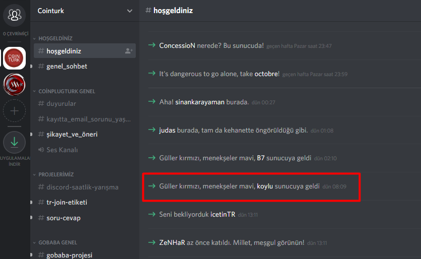Orada daha fazla insandan karşılık almak daha güzeldi. Cointürk discordunda sadece kagantrky cevap verip hoşgeldin demişken tryardım discordunda 8-9 kişiden hoşgeldin duymak ayrı mutlu etti.