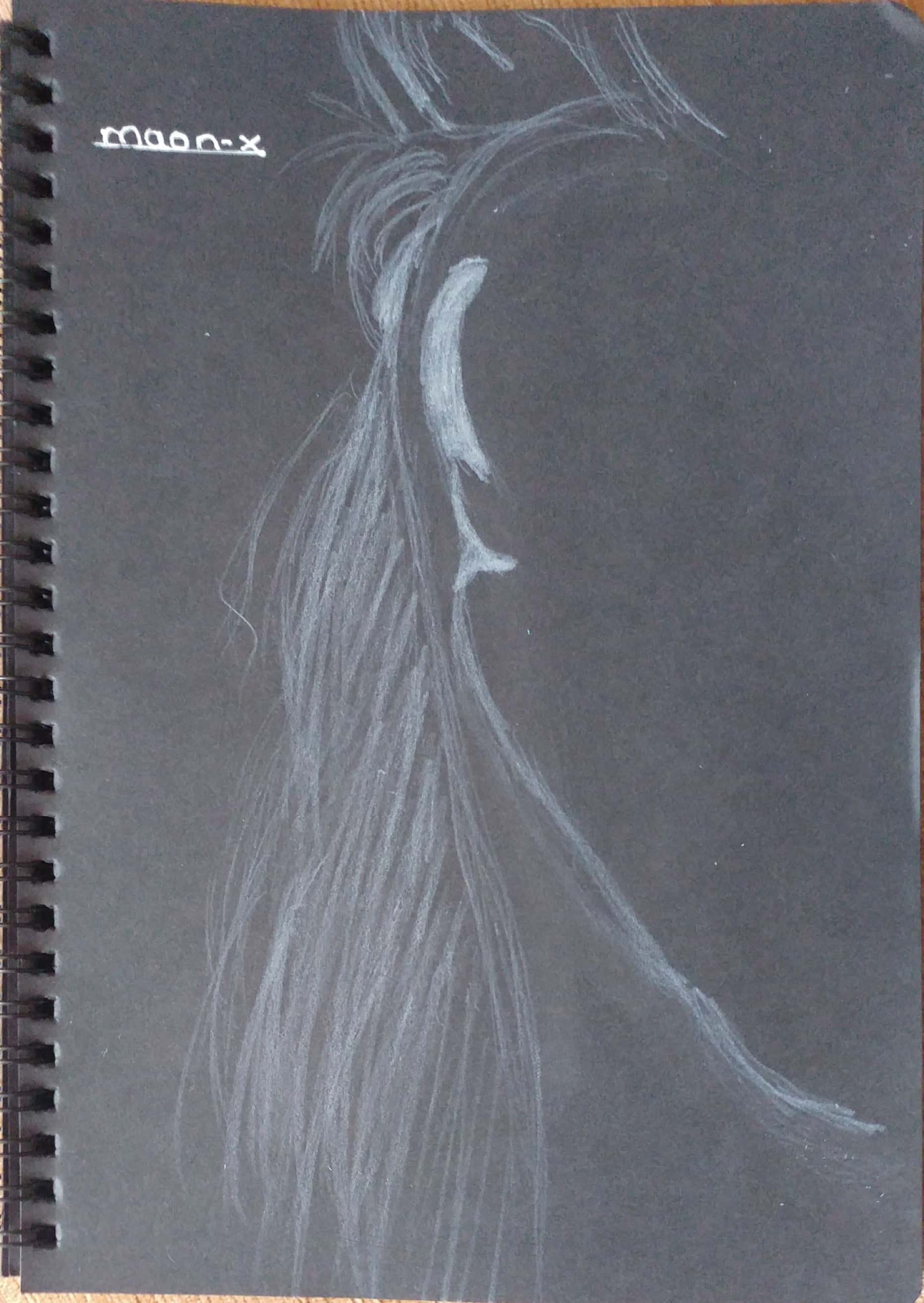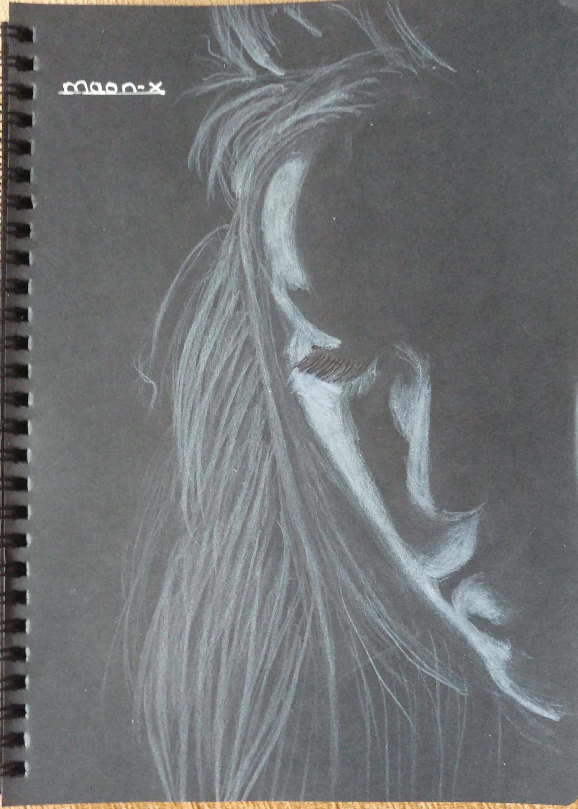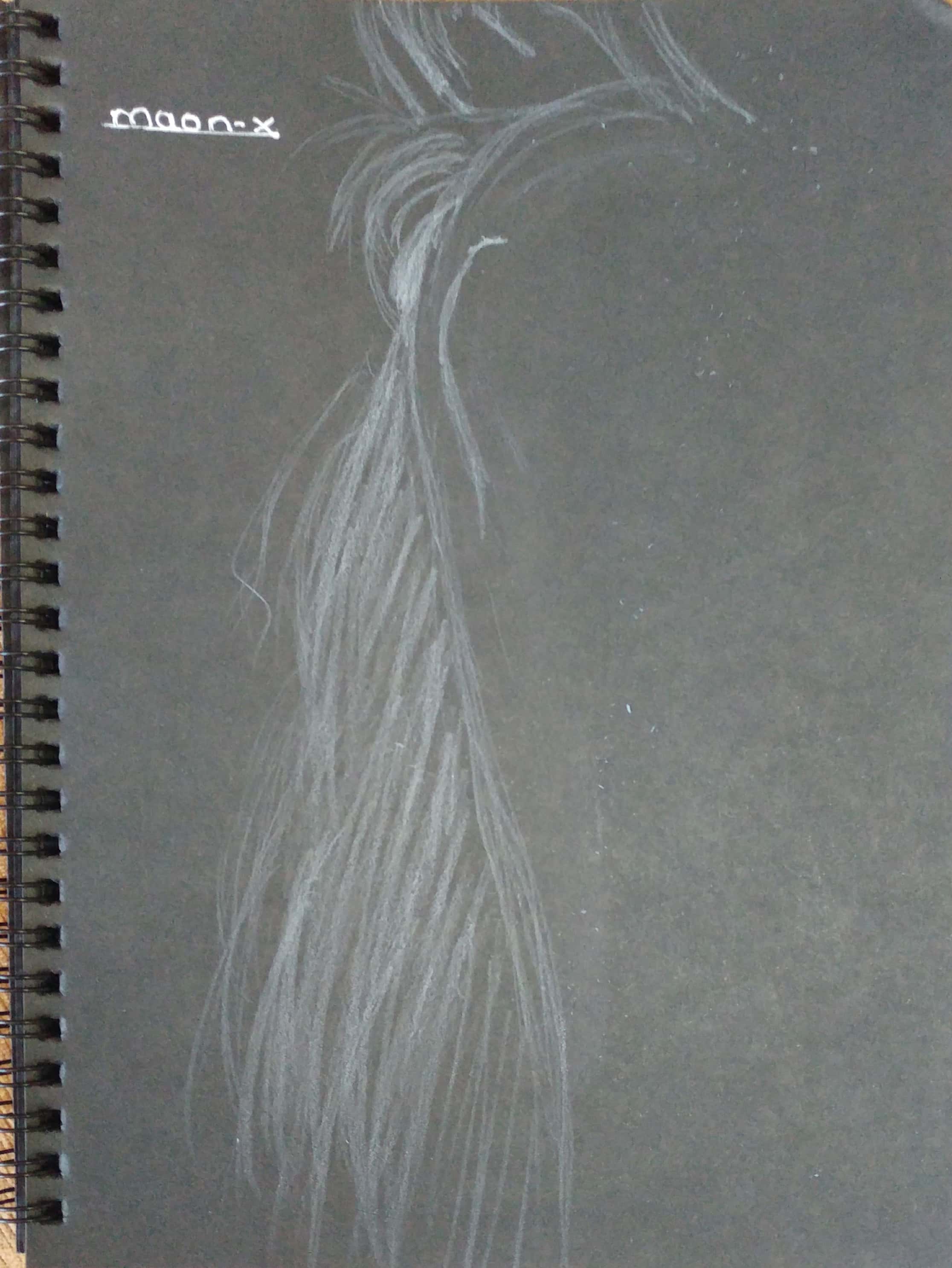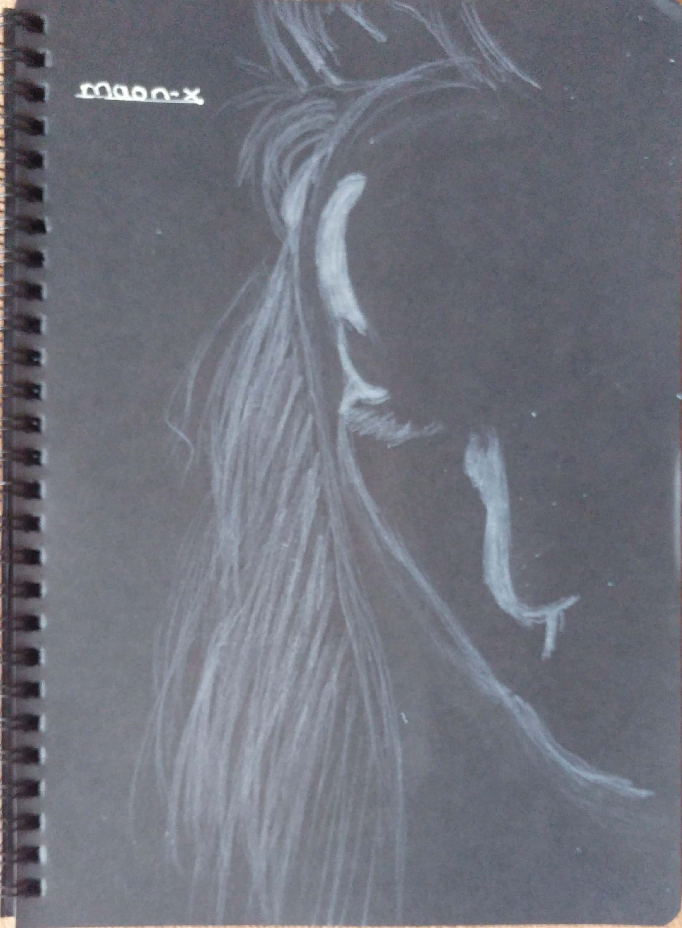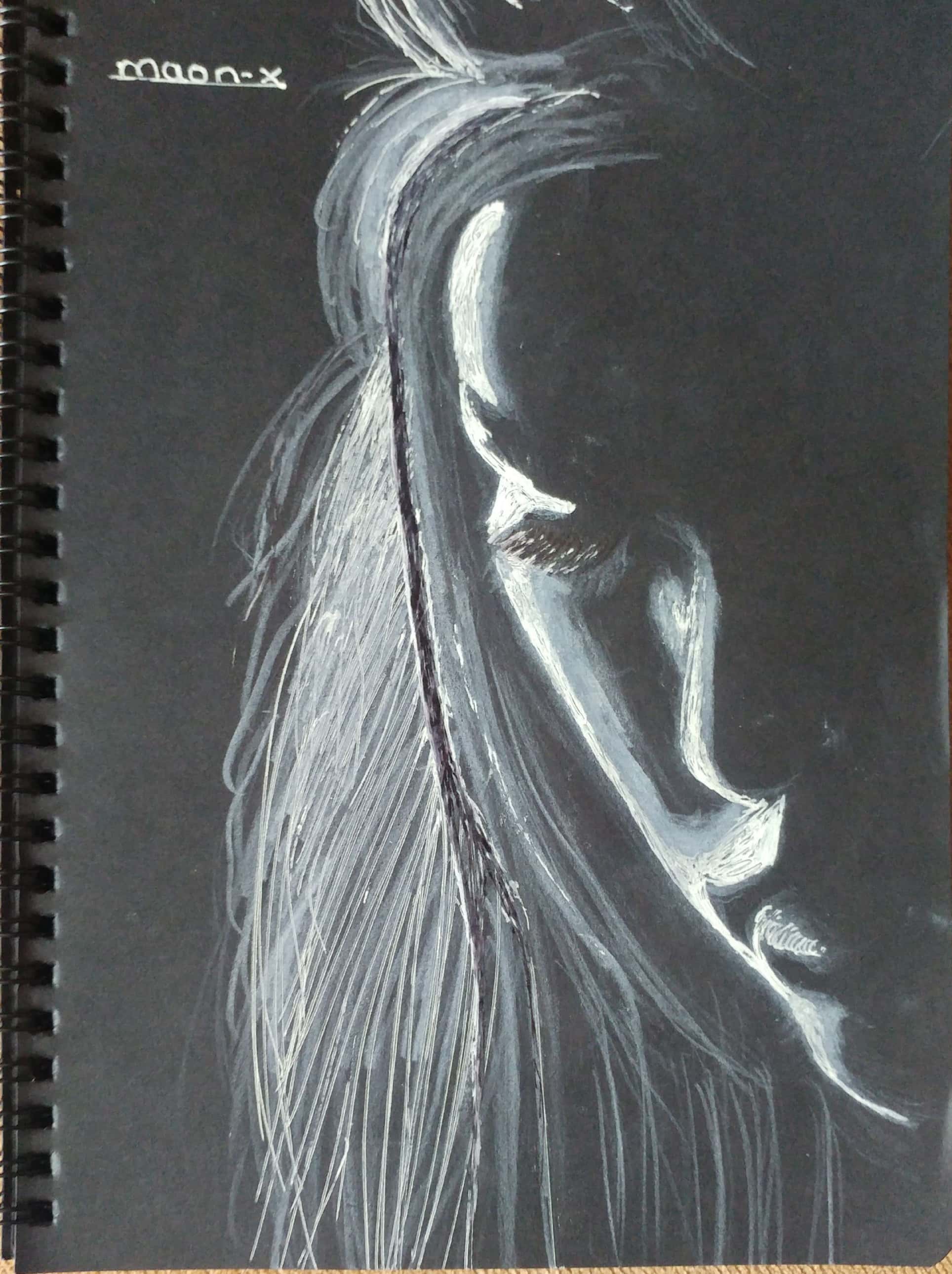 Önce kuru boya beyaz kalemi kullanarak resmi tamamladım. Daha sonra tükenmez kalemle üzerinden geçtim. Öncelikle saçları çizdim. Daha sonra alın ve yüz hatlarını ortaya çıkardıktan sonra kirpikler, dudak ve burnu da çizip resmi tamamladım.