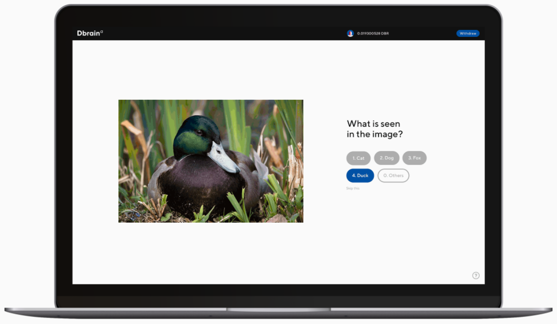 Aynı zamanda Dbrain kullanıcıları için hem gelir elde etmek hem de yapay zeka gelişimine katkıda bulunmak için bir fırsat var. Dbrain web uygulaması üzerinde yapay zekanın veri toplayıp kendisini geliştirmesine yardım sağlama amaçlı görevler yaparak DBR kazanabilirsiniz.