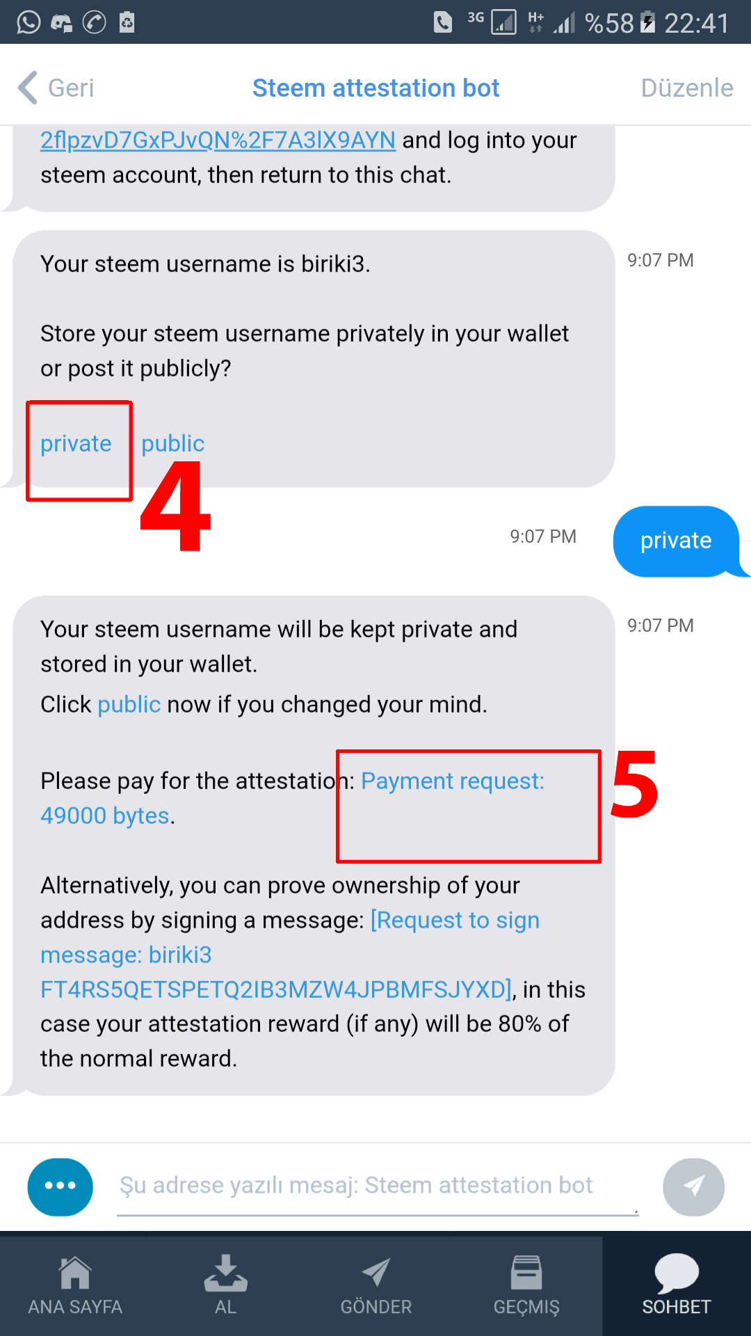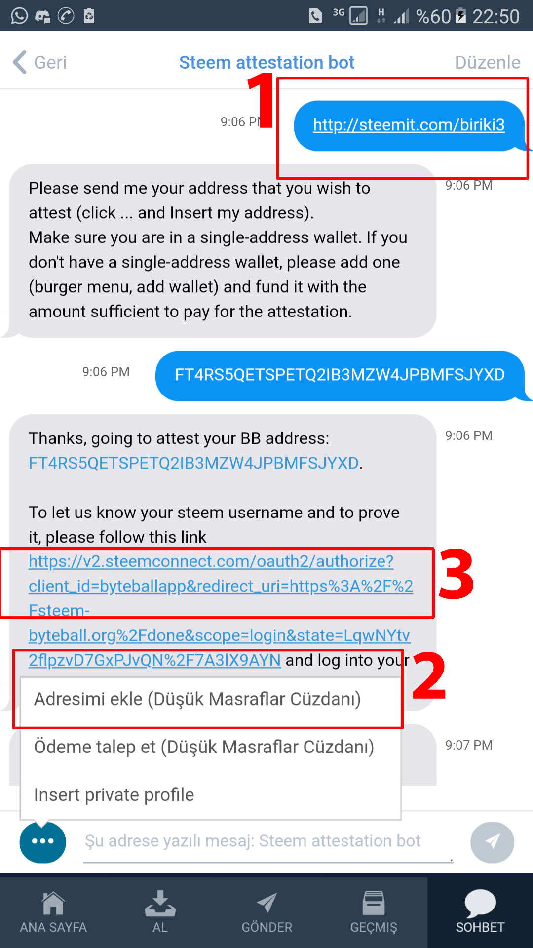 • Bot bir mesaj gönderecek yine. Bu mesajdaki Steemconnect linki aracılığıyla giriş yapın. Giriş yapınca hesabınız tanımlanacak.