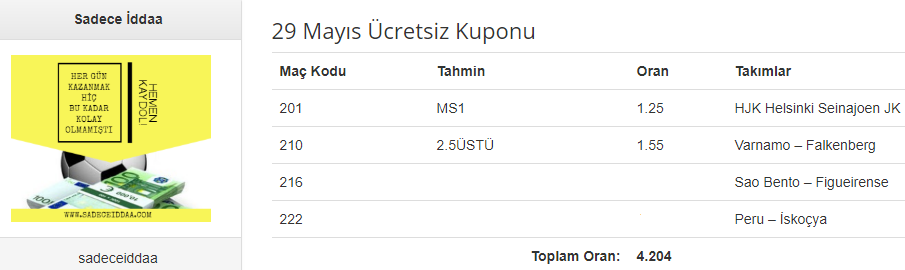 Günün Ücretsiz İddaa Kuponunun Tamamı her gün olduğu gibi yine www.sadeceiddaa.com da yayında. Üye olmadan bile siteye girip görebilirsiniz. Doğru bilgilerle üye olursanız diğer kuponlar için 10 kontör bizden hediye. #İddaaKuponu #iddaatahmin