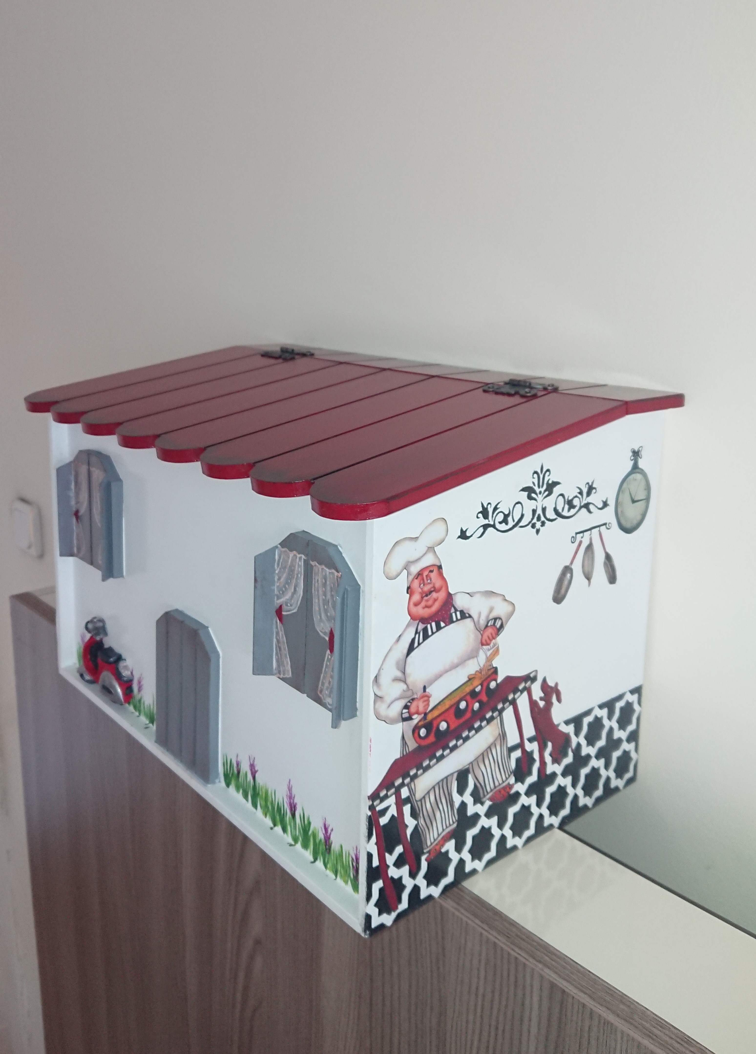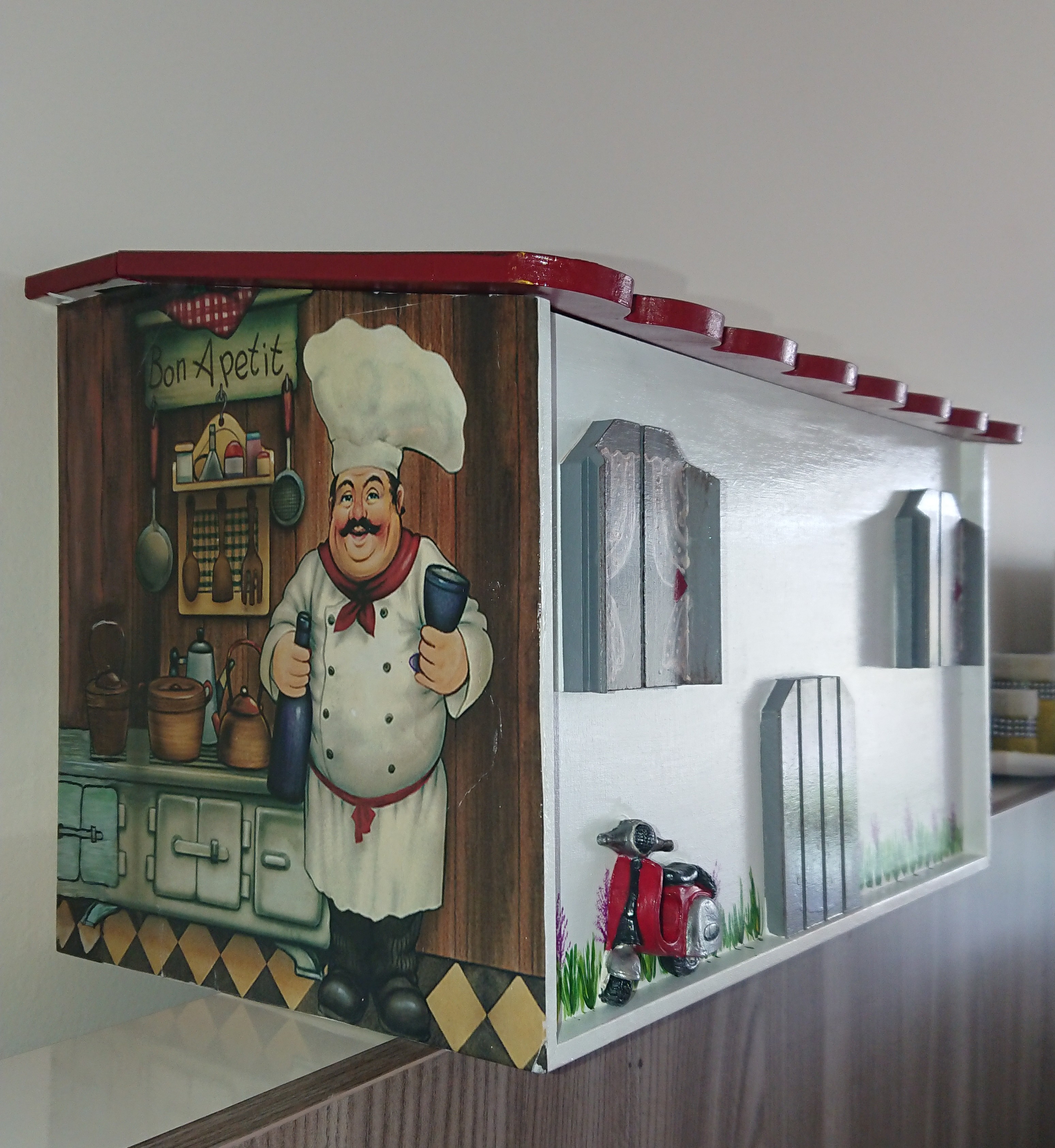 Mutfak ürünü olduğu için bolca aşçı dekopaj uyguladım, resmin bir kısmı el boyama ile tamamlandı. Renklerden anlaşılacağı üzere (: