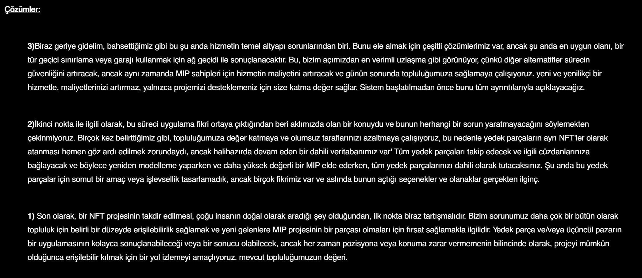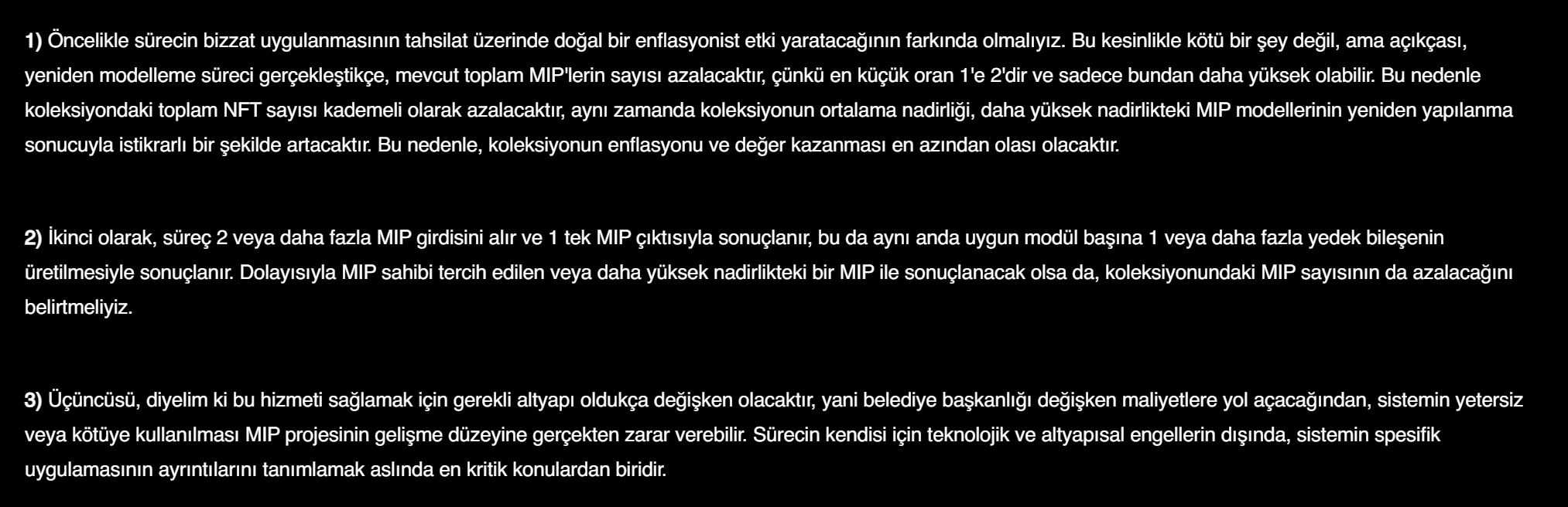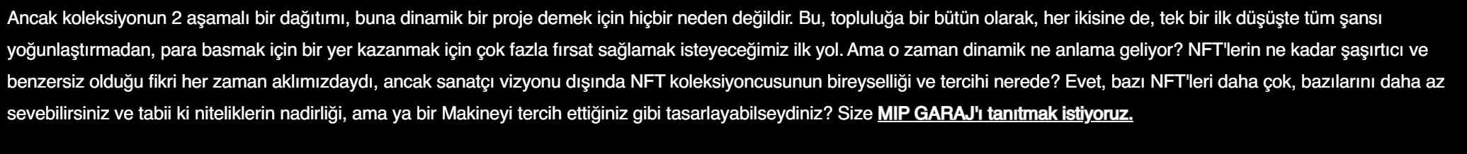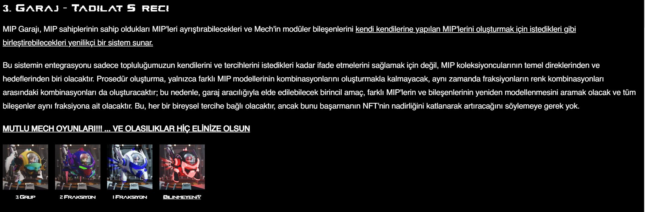 Bugün size uzun süredir takibimde olan bir projeden bahsetmek istiyorum. Sıradan tokeni olan bir NFT projesi değil MIP. Özellikleri ve ekosistem dostu olarak ortaya çıkan Mech Identity Protocol projesi basit NFT koleksiyonu değildir. NFT tasarım sanatçılarının özenle hazırladıkları ve emek vererek gün yüzüne çıkardıkları benzersiz ve şaşırtıcı tasarımlarını ve zanaatlarını sergileyen bir platform aslında.