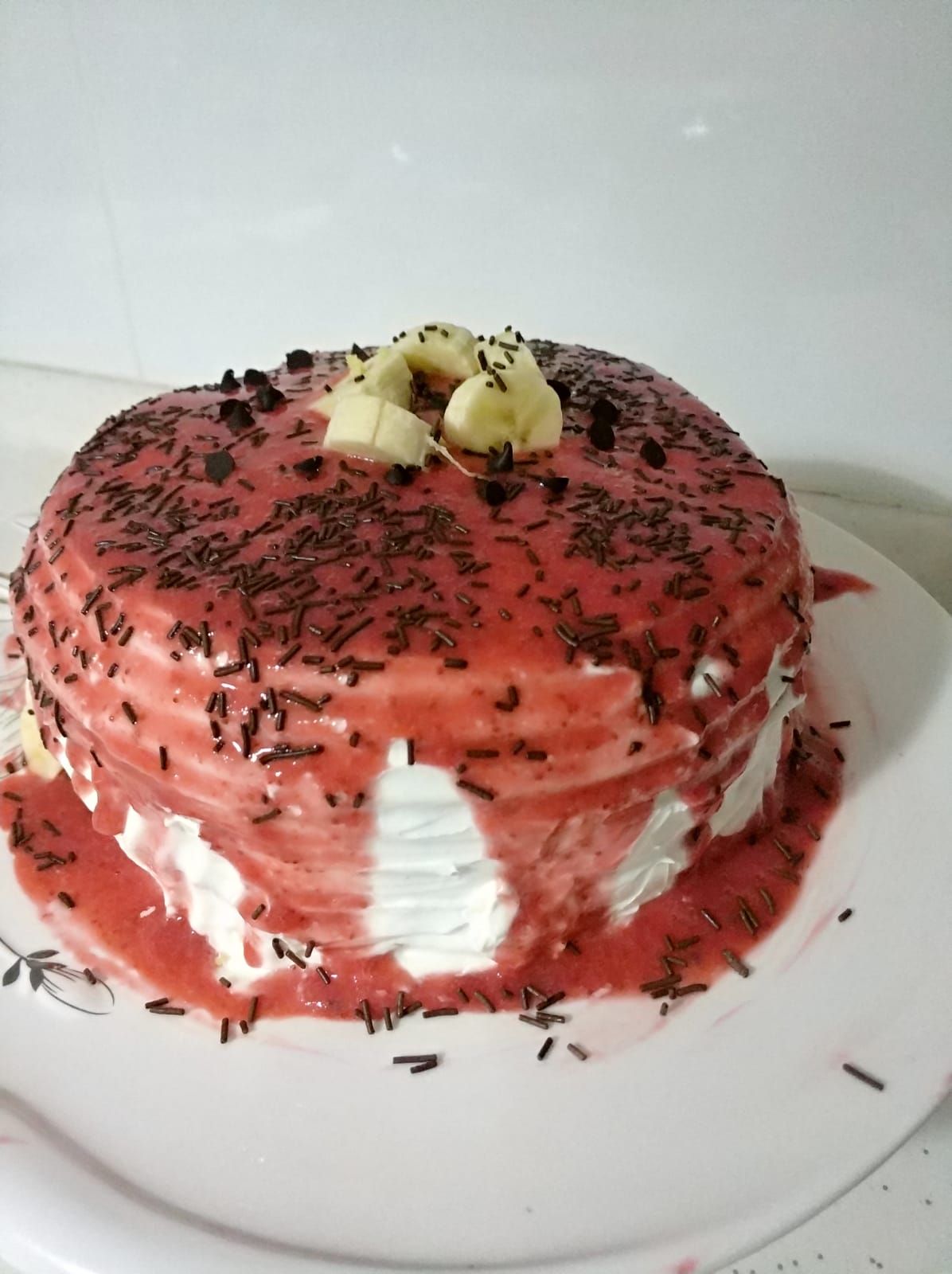 Kestikten sonra üç katta kesebilirmişim dedim, katlarım biraz kalın oldu ama bu seferlik fark etmez. İçini meyve ve pasta kreması ile doldurdum. Üzerine de krem şanti ve kendi yaptığım çilek sos ile süsledim. Biraz yamuk görüntüsüyle enfes bir pasta oldu.
