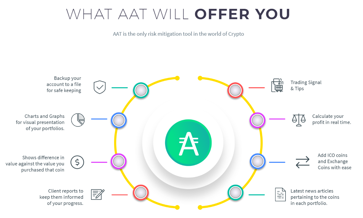 AAT-это программа на базе iOS и Android, которая включает в себя гайки и болты обычной платформы управления портфелем. Он предоставляет клиентам простой и эффективный подход к работе с большей частью их инвестиций ICO и цифровых денег, со всем оборудованием и опытом. Он обеспечивает клиентов с самым идеальным подходом для того чтобы общаться с их интересами, размещает их с их опасными показателями, и поставляет главные балансы. Аналогичным образом, приложение AAT является инструментом минимизации рисков, включая:
